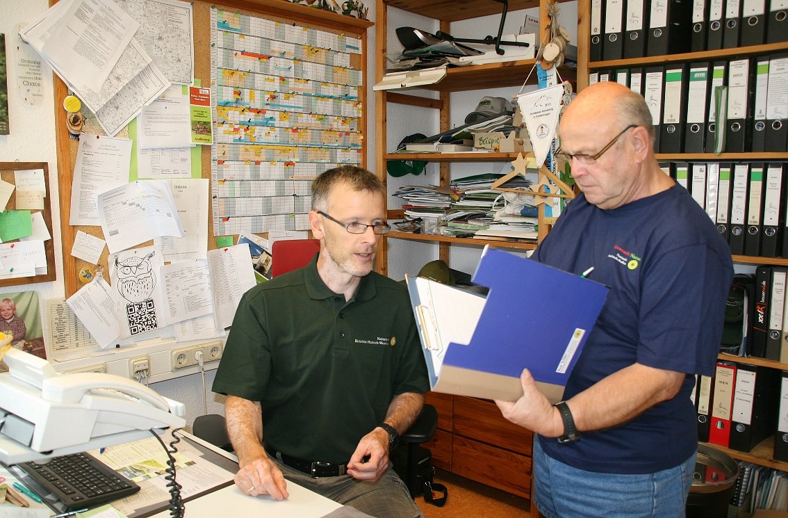 Regelmäßig übergibt Martin Schmidt (rechts) in der Naturparkverwaltung Fürstenhagen die Ergebnisse seiner Parkplatzrecherchen an Uwe Müller. Der Verantwortliche für Öffentlichkeitsarbeit leitet sie an das zuständige Thüringer Ministerium weiter.