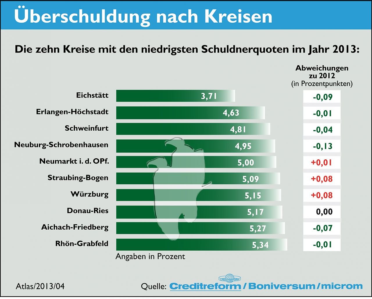 Den höchsten Anteil überschuldeter Bürger weisen 2013 Bremerhaven (19,84 Prozent), Offenbach am Main (18,61 Prozent), Wuppertal (17,89 Prozent), Pirmasens (17,73 Prozent) sowie Halle/Saale (17,57 Prozent) auf. Die wenigsten Schuldner im Verhältnis zur Einwohnerzahl registrieren Eichstätt (3,71 Prozent), Erlangen-Höchstadt (4,63 Prozent) und Schweinfurt (4,81 Prozent).Überschuldung ist eher ein Phänomen städtischen Lebens. An der Spitze der Großstädte stehen Duisburg (15,36 Prozent), Dortmund (14,01 Prozent) und Berlin (13,12 Prozent). Sowohl die negativen Kreise und Großstädte weisen wie die auf der positiven Seite genannten Regionen wenig Veränderung auf.