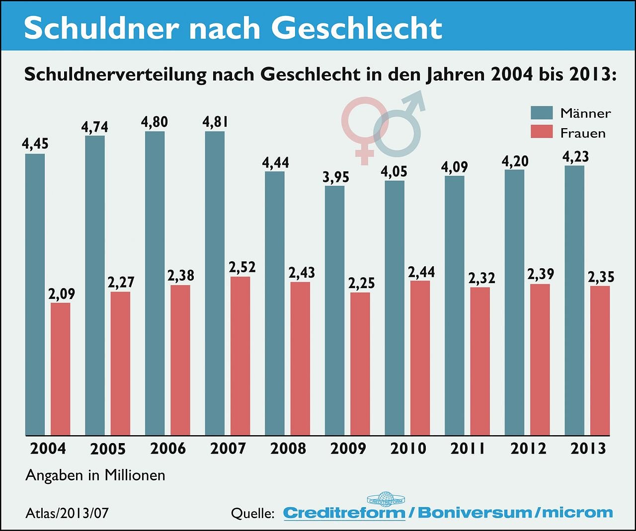 Auch wenn sich die Zahl überschuldeter Frauen gegenüber dem letzten Jahr um 1,7 Prozent verringert hat (minus 40.000 Überschuldungsfälle) und die der Männer um 0,7 Prozent erhöht hat (plus 30.000 Fälle), bleibt es beim langjährigen Trend. Die Schuldnerquote der Frauen hat im Vergleich der Jahre 2004 und 2013 von 6,1 Prozent auf 6,9 Prozent zugenommen, die der männlichen Schuldner von 13,6 auf rund 12,9 Prozent abgenommen. Dennoch ist Überschuldung eher Männern zuzuordnen: In Deutschland sind 2013 4,2 Mio. Schuldner männlich, 2,4 Mio. Schuldner weiblich.Die Situation der Überschuldung hat sich 2013 in Deutschland gegenüber dem Vorjahr wenig verändert. Dies betrifft sowohl die Zahlen überschuldeter Bürger insgesamt als auch die Strukturen im Hinblick auf Regionen, das Alter und das Geschlecht. Es fragt sich, wie diese Stagnation auf hohem Niveau im Zeichen einer guten Konjunktur und eines soliden Arbeitsmarktes zu bewerten ist.