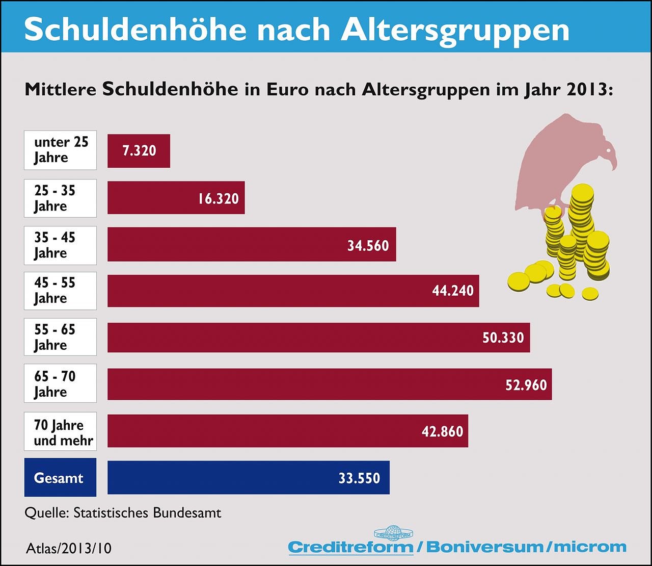 Aktuell ist die Zahl jugendlicher Schuldner unter 20 Jahren zwar von 216.000 Fällen (2012) auf 213.000 Fälle (2013) zurückgegangen, seit 2004 hat diese Altersgruppe jedoch mit einer Zunahme von 302 Prozent von 53.000 (2004) auf den aktuellen Wert von 213.000 am stärksten zugenommen. Eine markante Steigerung um 59,9 Prozent auf 1.581.000 Schuldner weist auch die nächste Altersgruppe der Twens zwischen 20 und 29 Jahren aus. Wenn auch auf deutlich geringerem Niveau absoluter Zahlen stimmt doch auch die Steigerung bei den über 70-jährigen Betroffenen von 42,3 Prozent auf 111.000 überschuldeter Privatpersonen von 2004 bis 2013 bedenklich.Frauen holen auf