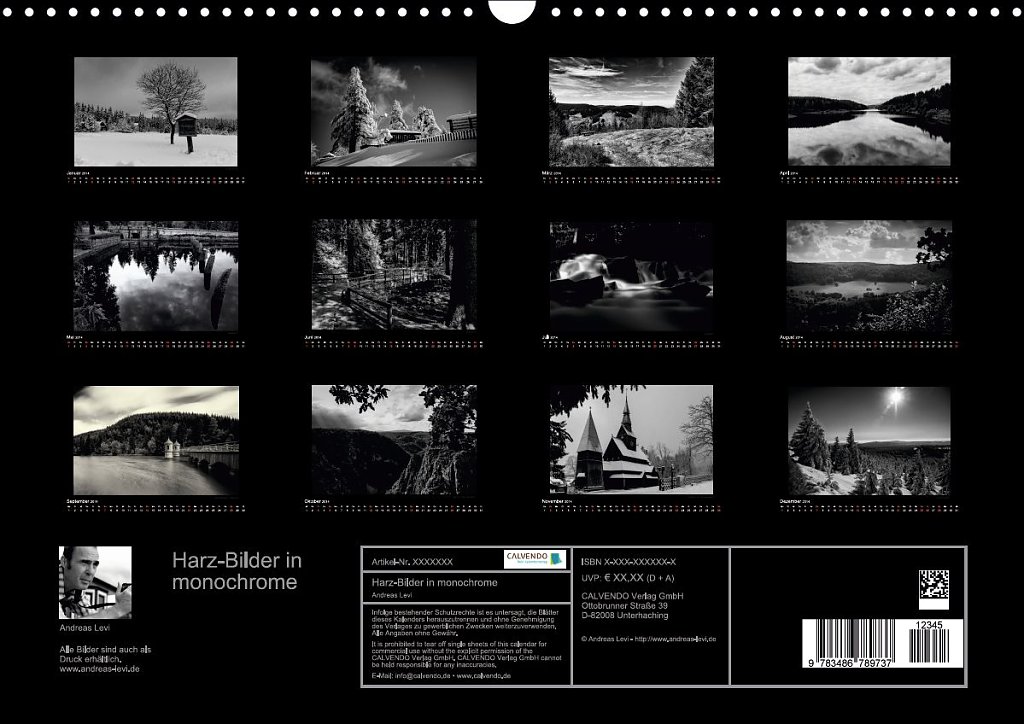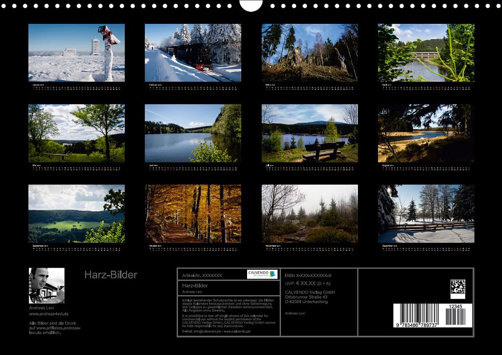 "Harz-Bilder", "Harz-Bilder in monochrome" und "Impressionen aus dem Harz" heißen die Kalender von Andreas Levi und zeigen neben regionaltypischen Motiven wie der Brockenbahn im Winter Aufnahmen u.a. vom Steinmühlental, einem Wanderweg zum Poppenbergturm im Herbst, eine Langzeitbelichtung der Nordhäuser Talsperre, sowie Aufnahmen der Burgruine Hohnstein, vom Falkenstein, dem Südharzer Vorland und von Seen und Talsperren des gesamten Harzes.