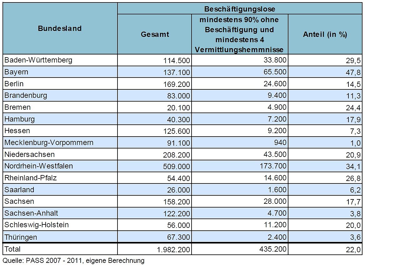 Bei den hier ausgewiesenen Werten für die Zielgruppe unter den Beschäftigungslosen auf der Ebene der einzelnen Bundesländer handelt es sich um eine näherungsweise Bestimmung auf der Basis von Stichprobendaten des PASS. Hierbei kann es zu Verzerrungen durch geringe Fallzahlen besonders in kleinen Bundesländern kommen.Doch wie groß ist der Personenkreis der Arbeitsmarktfernen überhaupt und was bedeutet arbeitsmarkfern? Bei unterschiedlichen Definitionen reichten die Schätzungen bisher von etwa 50.000 (Bundesagentur für Arbeit 2013) bis zu rund einer Million Menschen (Bundesarbeitsgemeinschaft der Freien Wohlfahrtspflege u.a. 2013). Aktuelle und statistisch verlässliche Zahlen lagen allerdings nicht vor. Diese Lücke schließt nun eine Studie des Instituts für Bildungs- und Sozialpolitik (IBUS) der Hochschule Koblenz.