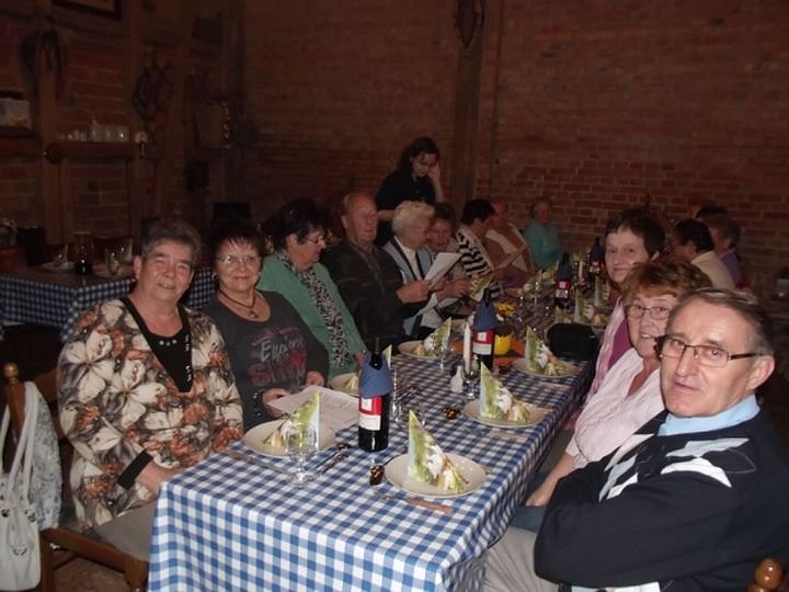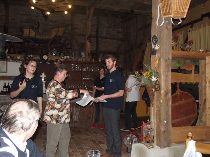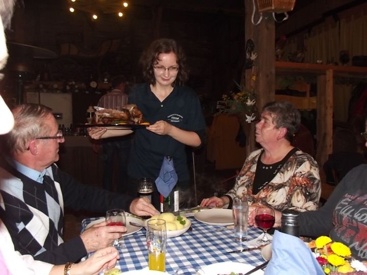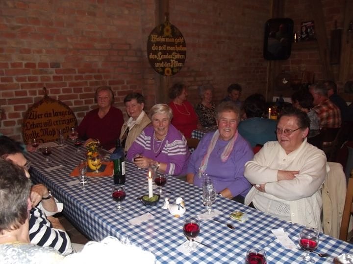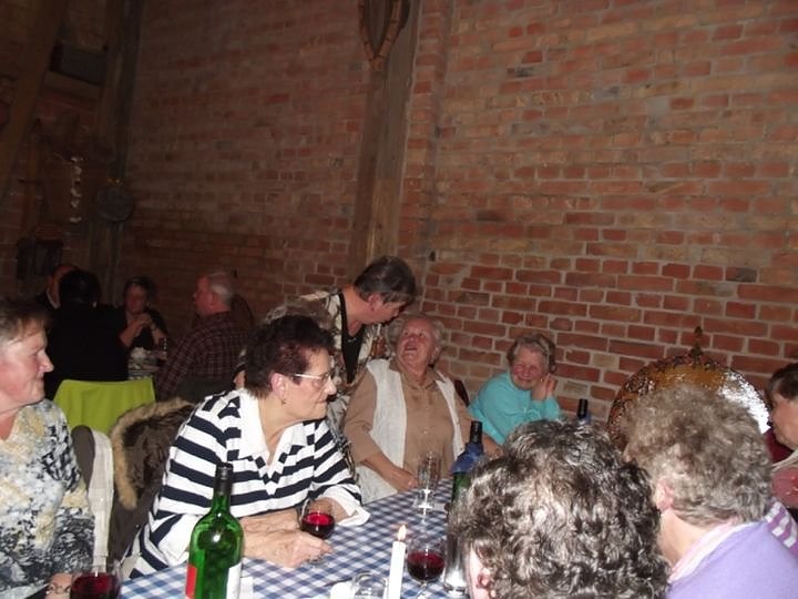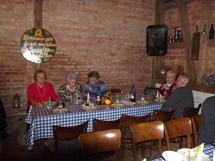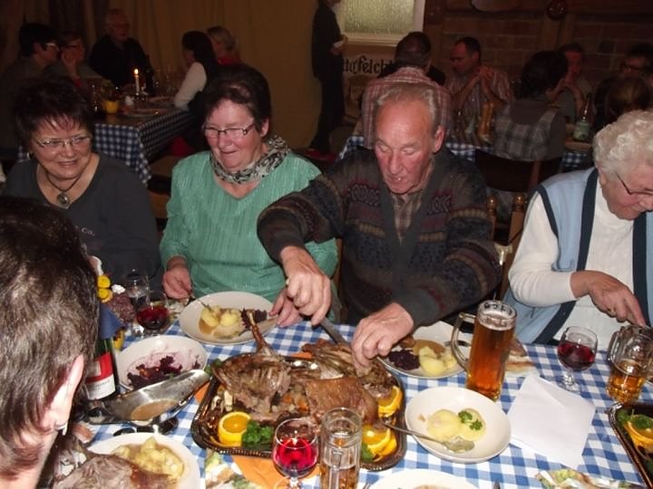 Diese Schlemmerfahrt, außerhalb unserer üblichen Veranstaltungstage (jeweils der 2. und 4. Dienstag im Monat) war wieder ein besonderes Erlebnis in illustrer Atmosphäre in der Nostalgiescheune der Fleischerei Tittmar. Bereits seit mehreren Jahren sind die dort veranstalteten Schlachtfeste, Martinsgans-Essen und andere Höhepunkte auch fester Bestandteil in unserer Planung des Vereinslebens im WB 4. Thomas Leipold hatte unsere Gruppe rechtzeitig vorher angemeldet und Plätze reservieren lassen und Christa Groß übernahm wieder die Organisation des Taxi Busses bei Funk Taxi Grambs für diesen Abend. Insgesamt 25 Senioren hatten sich hierfür angemeldet, unser ältester Gast mit bereits 88 Jahren wollte sich so ein Fest auch nicht entgehen lassen.