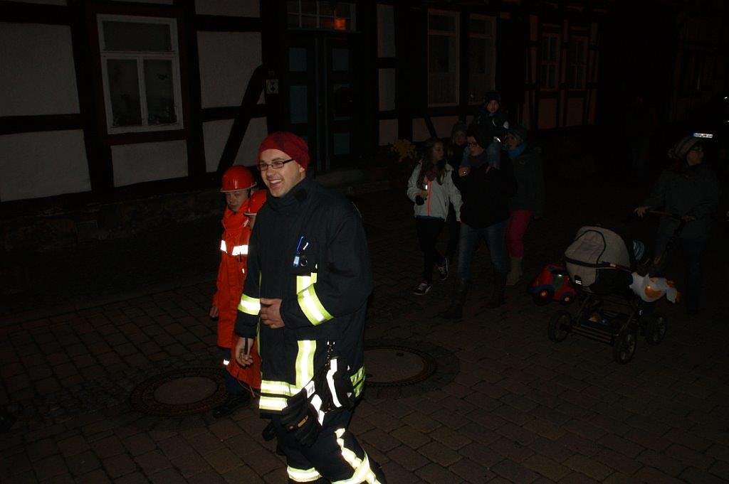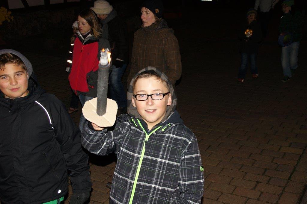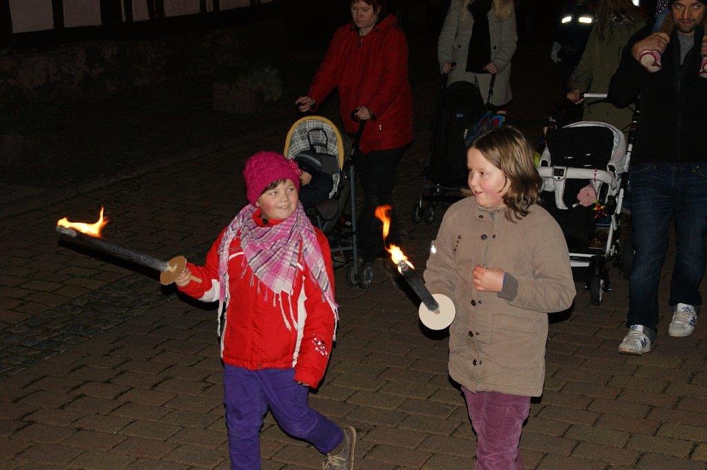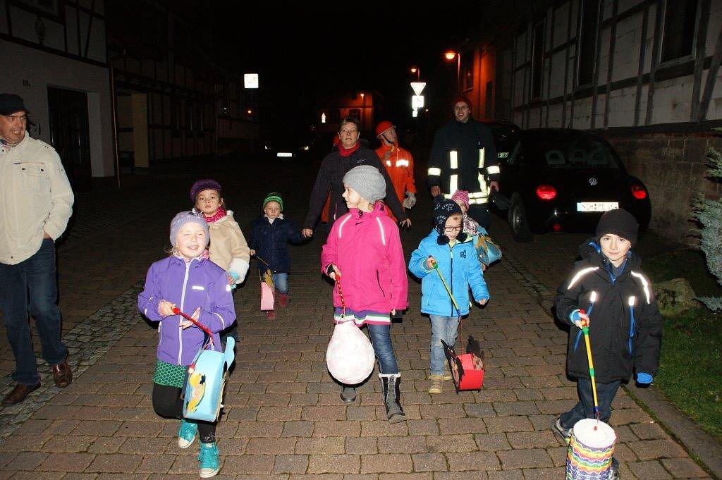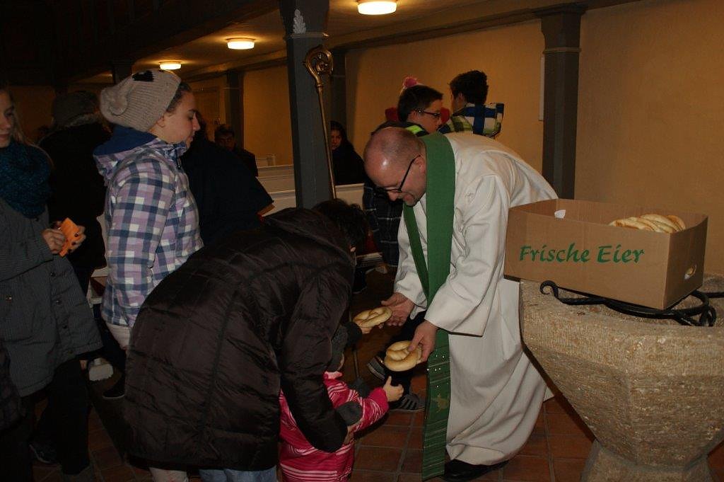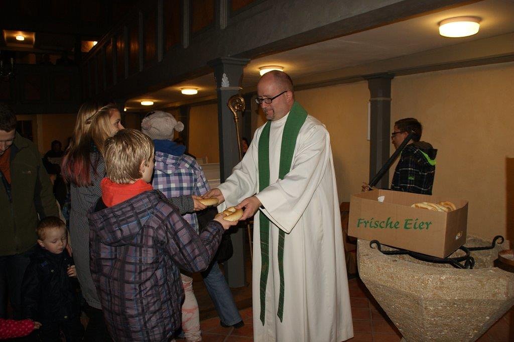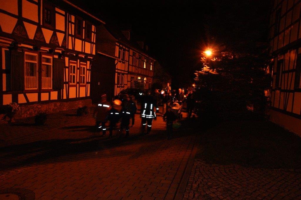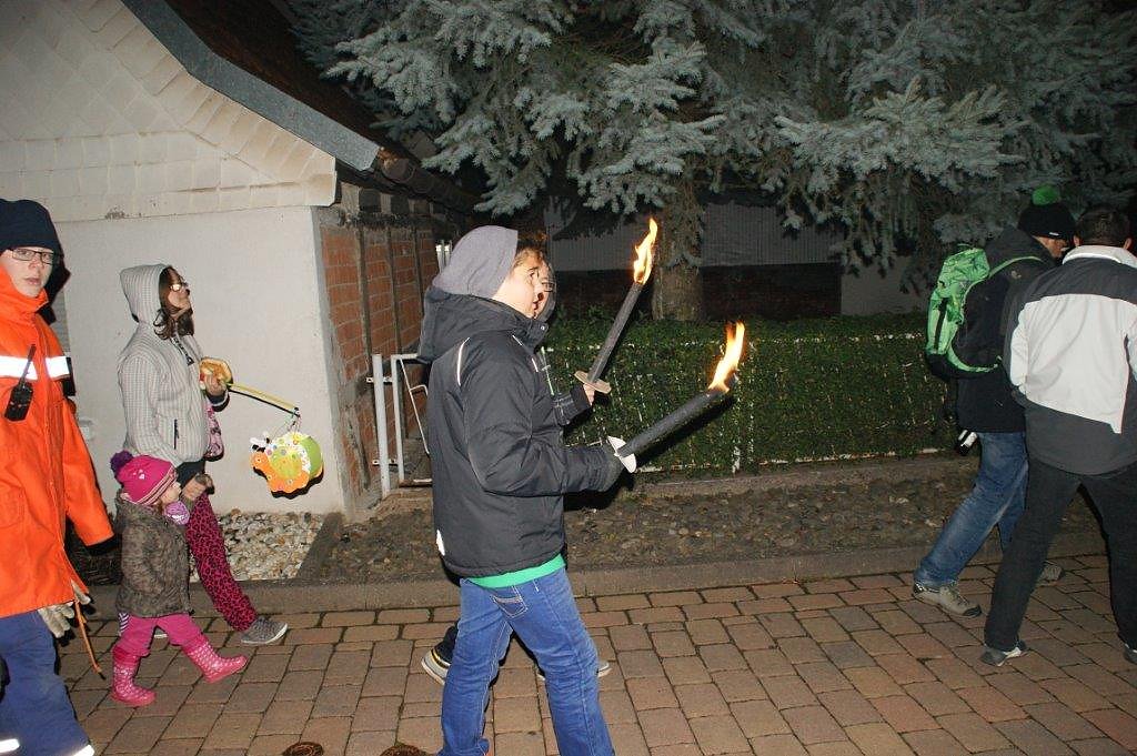 Nach der Aufführung des Martinsspiel wurden die bekannten Brezeln verteilt und geteilt. Im Anschluss and en Gottesdienst mit Pfarrer Bernhard Halverzogen große und kleine Obergebraer durch das Dorf. Begleitet wurden sie von der Freiwilligen Feuerwehr des Ortes.