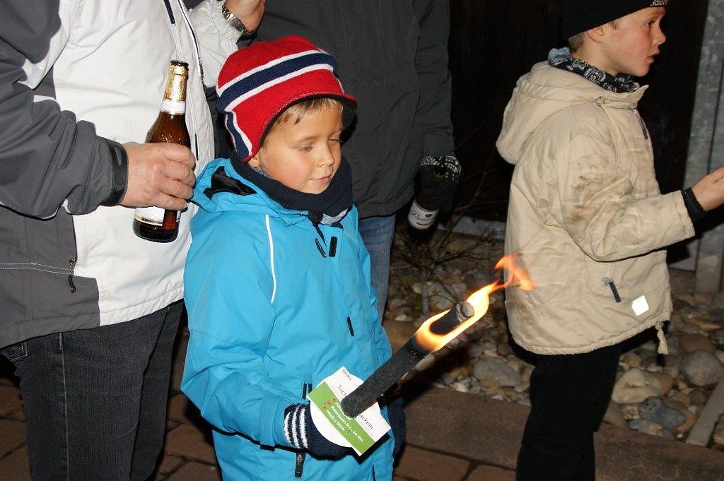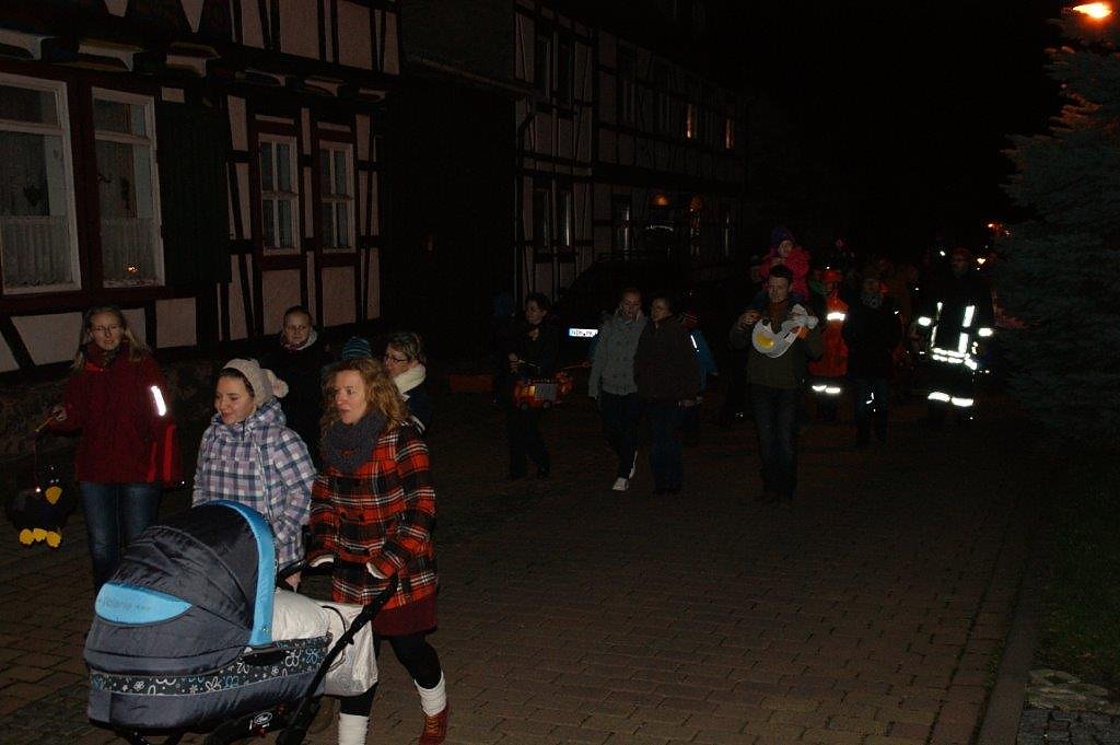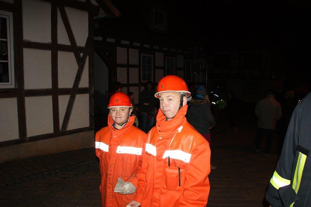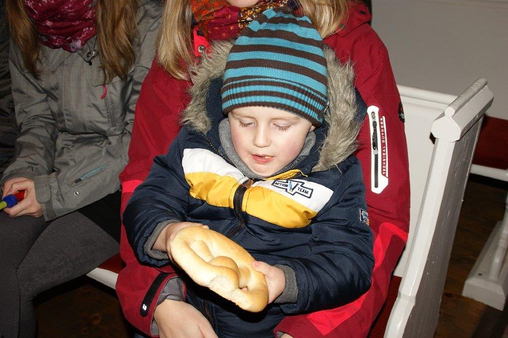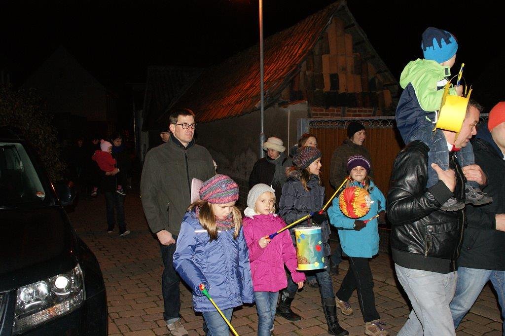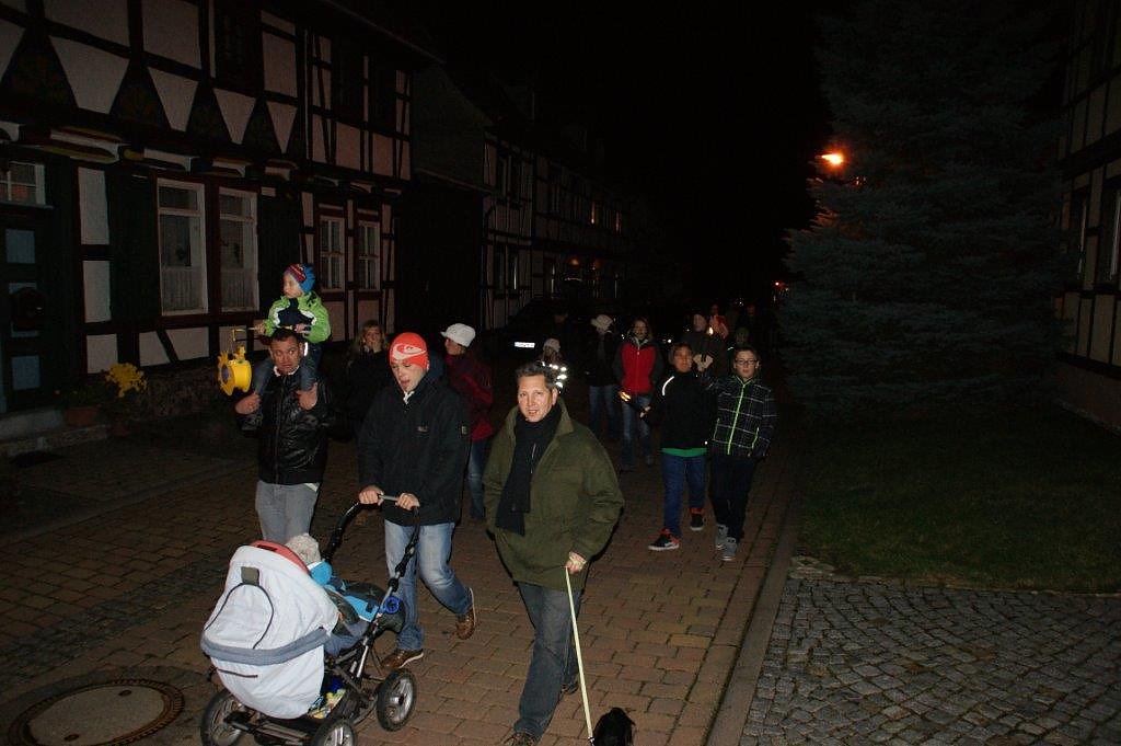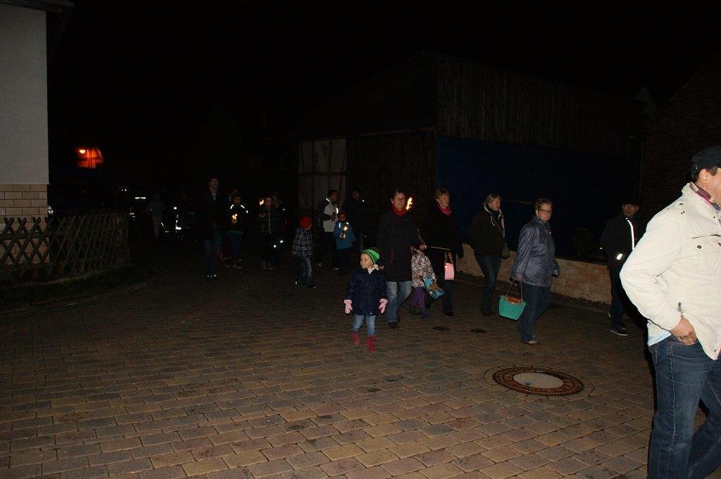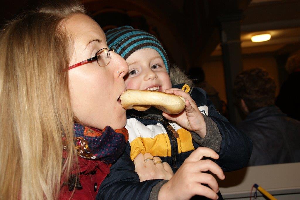 Nach der Aufführung des Martinsspiel wurden die bekannten Brezeln verteilt und geteilt. Im Anschluss and en Gottesdienst mit Pfarrer Bernhard Halverzogen große und kleine Obergebraer durch das Dorf. Begleitet wurden sie von der Freiwilligen Feuerwehr des Ortes.