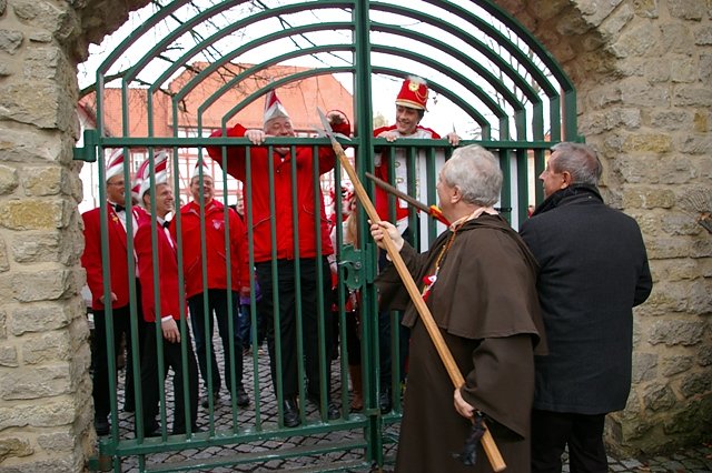 Punkt 11.11 Uhr versuchen die Karnevalisten ins Gülden Creutz zu kommen und dem Ortsbürgermeister die Schlüssel abzunehmen. Der gibt sie naatürlich nicht ganz so freiwillig. Das große Tor ist allerdings nur die erste Hürde. Im Hof wartet eine weitere, denn da heißt es, eine recht hohe Leiter zu erklimmen, um den anderen die Tür zu öffnen.