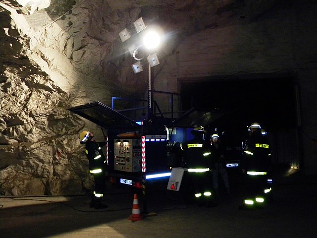 Gegen 9.00 Uhr trafen die Einheiten unter Führung des Zugtrupps auf dem Gelände ein. Nach Erkundung und Lagebesprechung wurde der Einsatzauftrag verkündet. Nach einem Stromausfall muss das Stollensystem ausgeleuchtet werden, um termingerecht Kulturgüter einlagern zu können. Nach und nach fuhren die Fachgruppen mit ihren Fahrzeugen in den Stollen und schafften es so, eine Strecke von ca. 800 m mit Hilfe ihrer Lichtmastanlagen mit Flutlichtscheinwerfern sowie mehreren Leuchtensätzen (Stativ-Powermoon) taghell auszuleuchten. Gegen 14.00 Uhr war der Einsatzauftrag erfüllt, so dass der erwartet LKW mit den zu lagernden Kulturgütern wie geplant in den Stollen einfahren konnte.