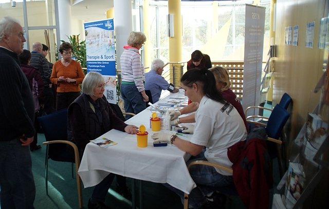 Nach einer kurzen Pause in der, wie auch schon vor Beginn der Veranstaltung, durch das Gesundheitsamt Check-Ups (Blutdruck-, Blutzucker-, Cholesterin und Körperfettmessungen) gemacht wurden, erzählte Verena Jennicke, die Leiterin der Selbsthilfegruppe Diabetes in Uder, von ihren langjährigen Erfahrungen als Diabetikerin – auch zu den Risiken der Herzerkrankungen.