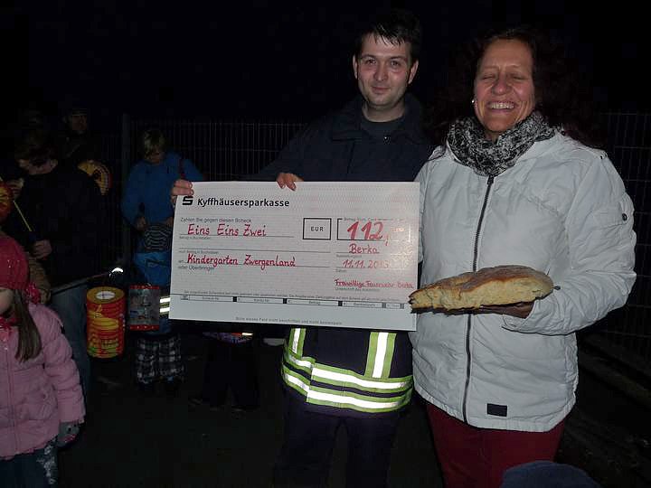 Thomas Bachmann von der Jugendfeuerwehr übergab der Kita-Leiterin Martina Kunze einen Scheck für die Einrichtung in Höhe von 112 Euro. Gut zu merken, denn irgendwie kommt einem die Zahl bekannt vor.