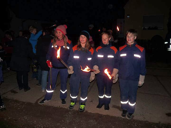 Mit Fackeln voran ging die Jugendfeuerfeuer des Ortsteils. Ausgangspunkt des Lampionumzugs war das Gerätehaus der Freiwilligen Feuerwehr Berka.