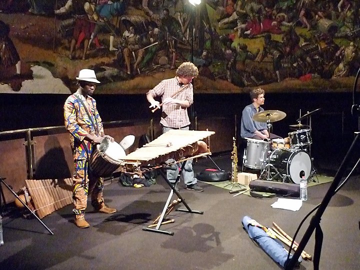 Der Auftritt von DJEKAFO folgte unmittelbar der Führung durch das Rundbild und sorgte mit seiner afrikanisch-jazzigen Melange für einen weiteren musikalischen Höhepunkt an diesem Abend, der überaus begeistert aufgenommen wurde. Zwischenzeitlich stellte Michael Wollenheit interessierten Gästen Werke aus der Museumssammlung in der Studiogalerie vor und einige Kursteilnehmer veranschaulichten einige didaktische Sachverhalte ihrer Werke, so konnte man bei Bettina Lotzwik und Kerstin Knab etwas über das perspektivische Zeichnen und die verschiedenen Konstruktionsmöglichkeiten erfahren, Angela Böhme ließ Rhythmen nach Musik malen und Carolin Knoll stellte die surrealistisch-phantastischen Werke vor, die nach dem Erlebnis technischen Anlagen in der Oldislebener Zuckerfabrik entstanden sind.