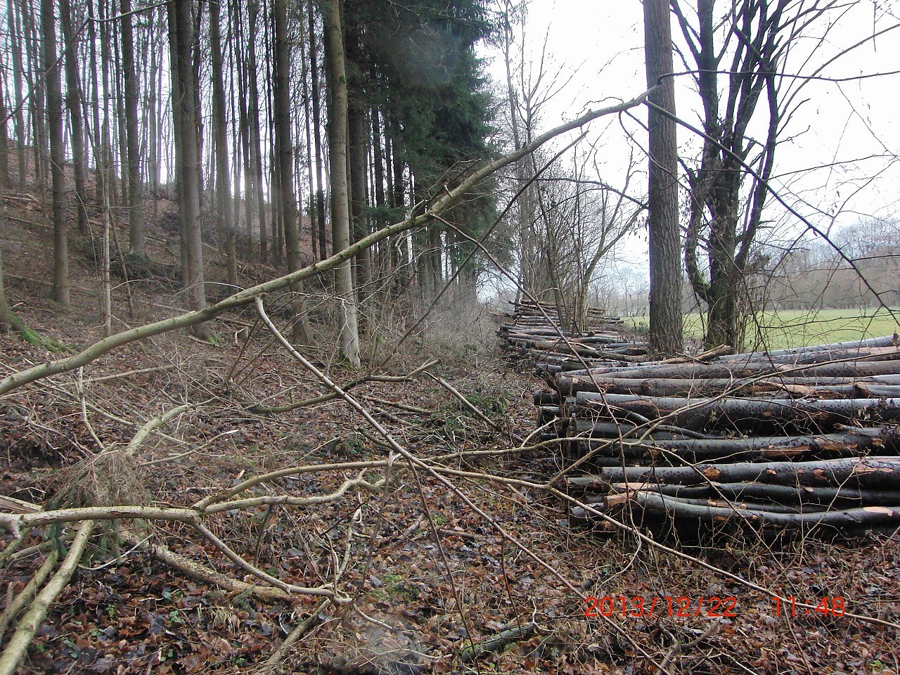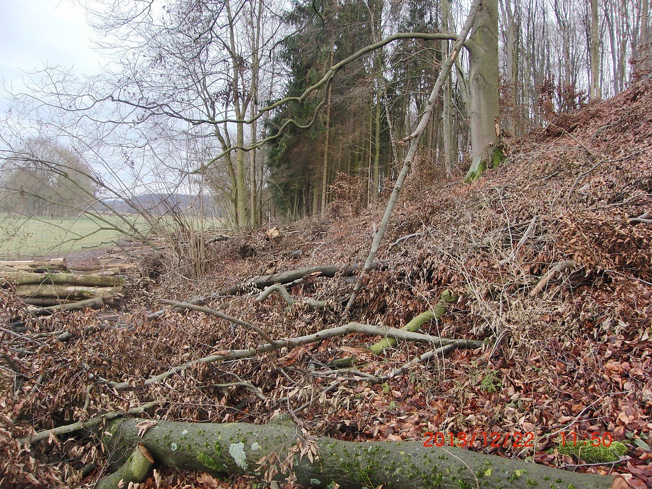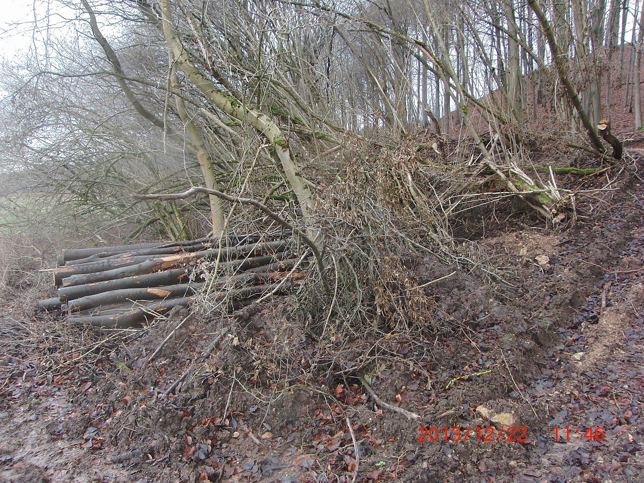 Wer den Karstwanderweg hier gegenwärtig nutzen will, der kann dies nicht tun, weil er faktisch nicht mehr existiert bzw. nicht mehr sichtbar ist: Missbraucht als Holzlagerplatz und Bulldozerfahrstrecke. Ausweichmöglichkeiten gibt es nur auf die an das Waldgebiet nördlich angrenzende Wiesen der Wiedaaue, die randlich jedoch ebenfalls von Forstfahrzeugen aufgewühlt wurde. Die Färbung des lagernden Holzes beweist, dass der Forst hier schon vor mehreren Wochen tätig war.