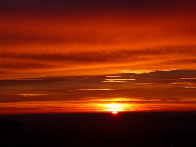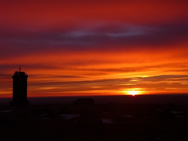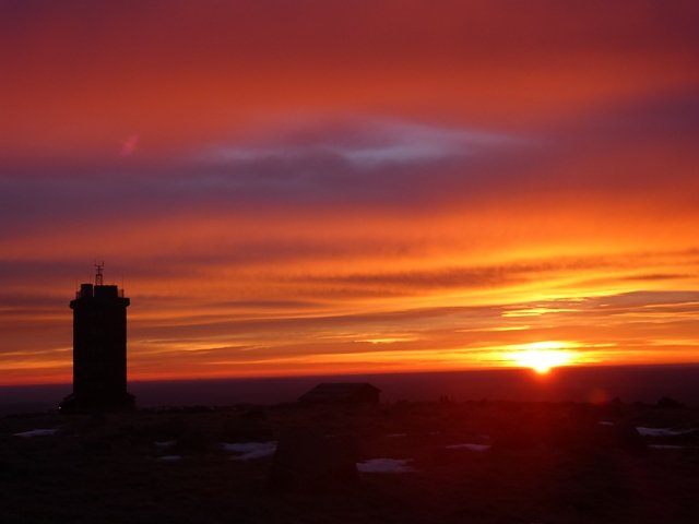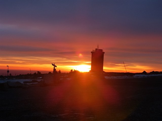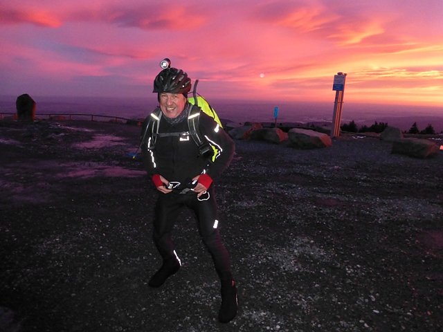 In diesem Jahr war es eine wunderbarer Sonnenaufgang, der die Radfahrer auf dem Gipfel belohnte. Zuvor war es jedoch notwendig, gegen die teilweise heftigen Sturmböen anzukämpfen, um das Gipfelplateau zu erreichen. Teilweise war Teamarbeit gefragt, Mensch und Material zu stabilisieren. In tiefrotem Farbspiel erschien der Stern am Horizont und tauchte alles in ein warmes Licht, das sich trotz kaltem Sturmwind angenehm anfühlte.