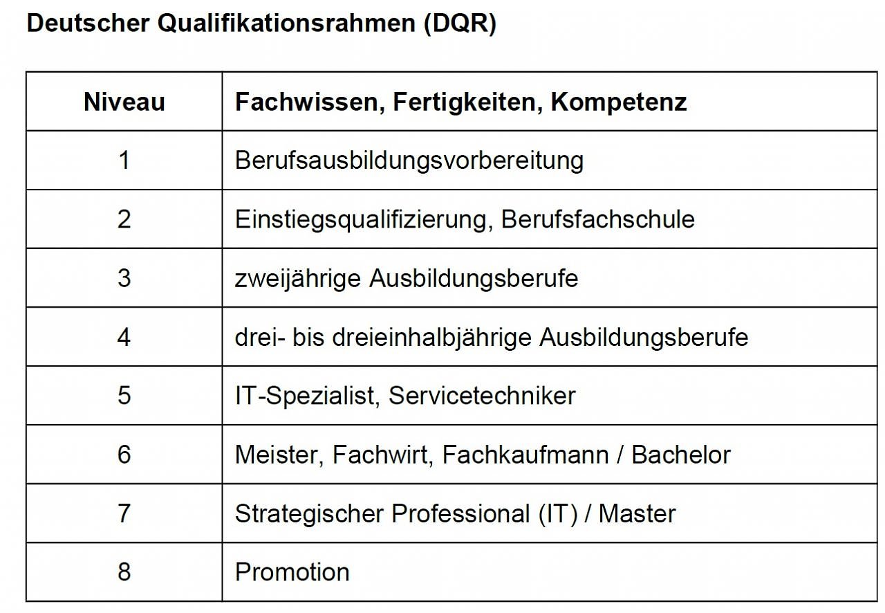 Um Bildungsabschlüsse innerhalb der europäischen Länder vergleichen zu können, wurde ein Europäischer Qualifikationsrahmen entwickelt, der die Grundlage für den Deutschen Qualifikationsrahmen (DQR) bildet. Er verfügt über insgesamt acht Niveaustufen, die das jeweilige Fachwissen, die Fertigkeiten und Kompetenz beschreiben.