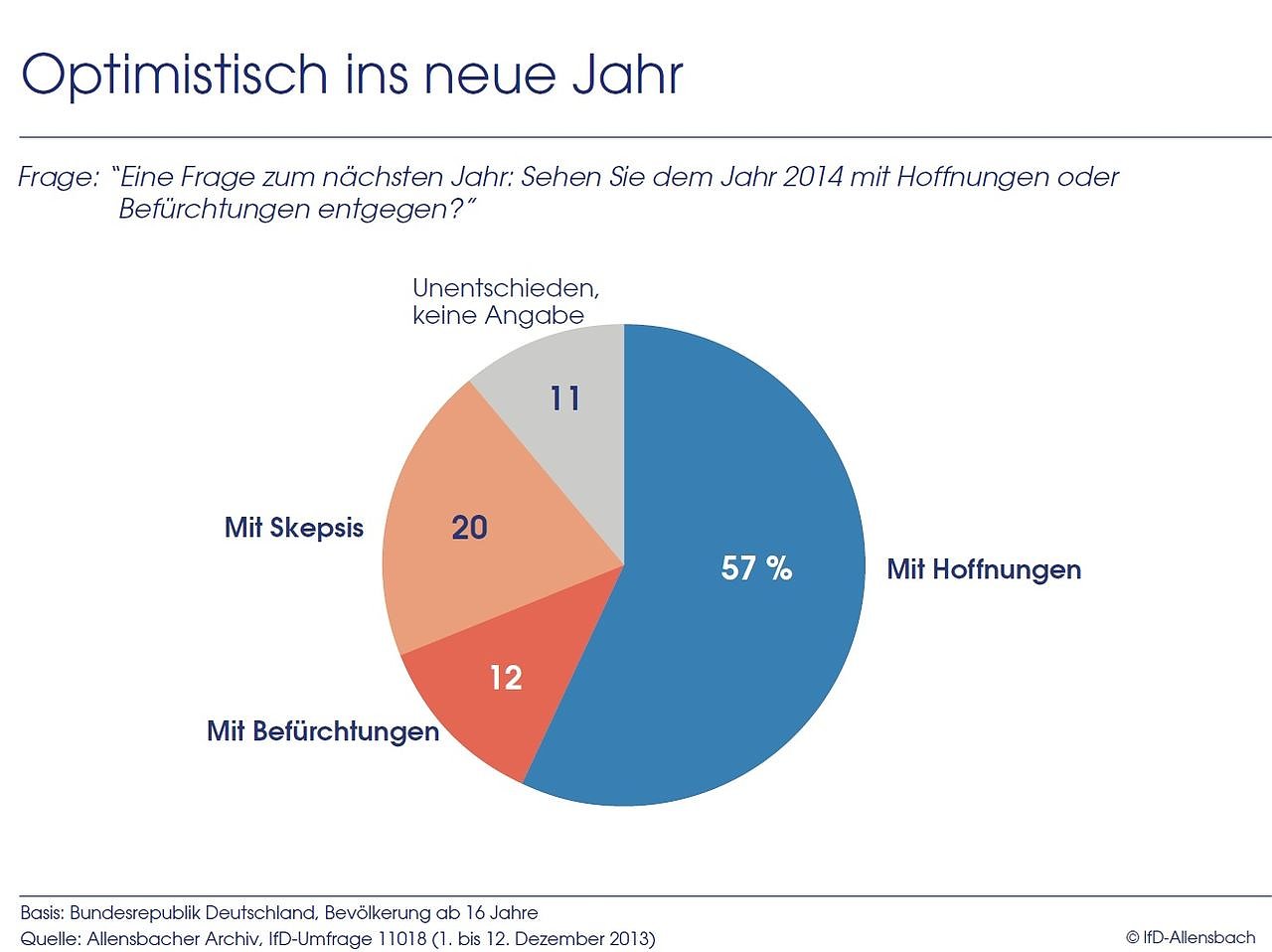 Schon seit 1949 stellt das Institut für Demoskopie zum Jahreswechsel an die Bürger die Frage, ob sie dem neuen Jahr mit Hoffnungen oder Befürchtungen entgegensehen. Besonders in den 1950ern, 1960ern und auch noch den 1970ern zeigte sich in der Bevölkerung ein ausgeprägt positives Stimmungsbild. Seit 1990, vor allem aber seit 2000 gab es dagegen nur wenige Jahre, in denen die Mehrheit der Bevölkerung für das darauf folgende Jahr positiv gestimmt war. Der diesjährige Anteil von 57 Prozent der Bevölkerung, die das neue Jahr mit Hoffnungen erwarten, ist der höchste seit Mitte der 1990er Jahre. Die Ergebnisse der Neujahrsfrage haben sich den letzten Jahrzehnten als verlässlicher Indikator nicht nur für die Konsumstimmung, sondern auch für die gesamtwirtschaftliche Entwicklung des kommenden Jahres erwiesen.