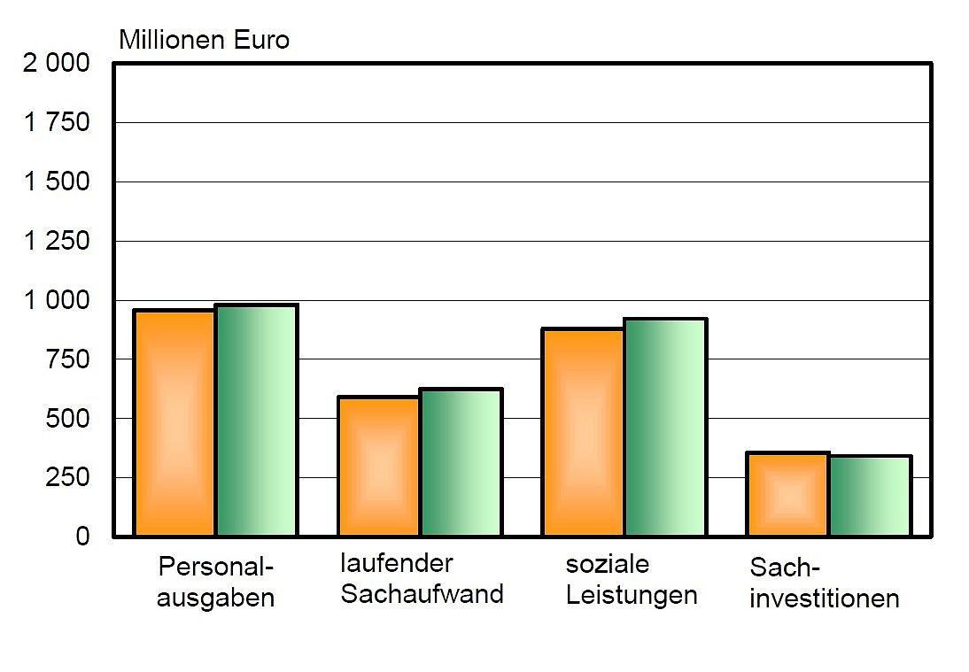 Die Ausgaben für soziale Leistungen beliefen sich auf 921 Millionen Euro, dies war ein Anstieg von 43 Millionen Euro. Der Mehrbedarf wurde vorrangig für die Sozialhilfe (+ 28 Millionen Euro), für die Jugendhilfe (+ 7 Millionen Euro) sowie für die Leistungen nach dem Asylbewerberleistungsgesetz (+ 5 Millionen Euro) ausgegeben.