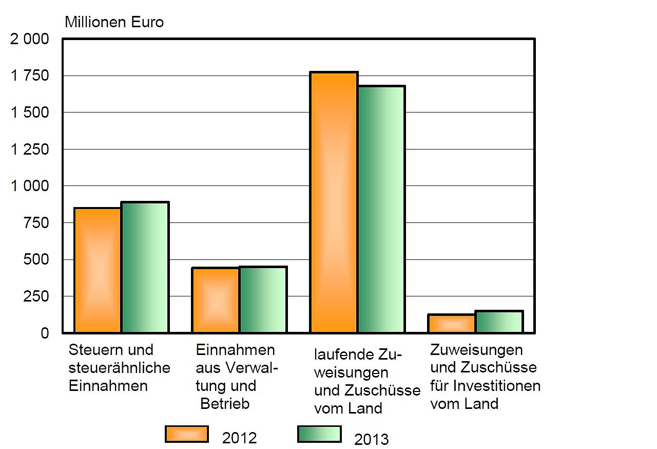 Die laufenden und investiven Finanzzuweisungen vom Land bildeten mit einem Volumen von 1 830 Millionen Euro bzw. einem Anteil von 53,1 Prozent noch immer den größten Anteil an den Gesamteinnahmen. Sie sanken gegenüber den ersten neun Monaten 2012 um 72 Millionen Euro. Davon wurden als laufende Zuweisungen und Zuschüsse sowie Erstattungen vom Land 1 679 Millionen Euro gezahlt. Das waren 96 Millionen Euro weniger als im vergleichbaren Vorjahreszeitraum. Die Zuweisungen für Investitionen vom Land betrugen 151 Millionen Euro, 25 Millionen Euro mehr als im gleichen Zeitraum 2012.