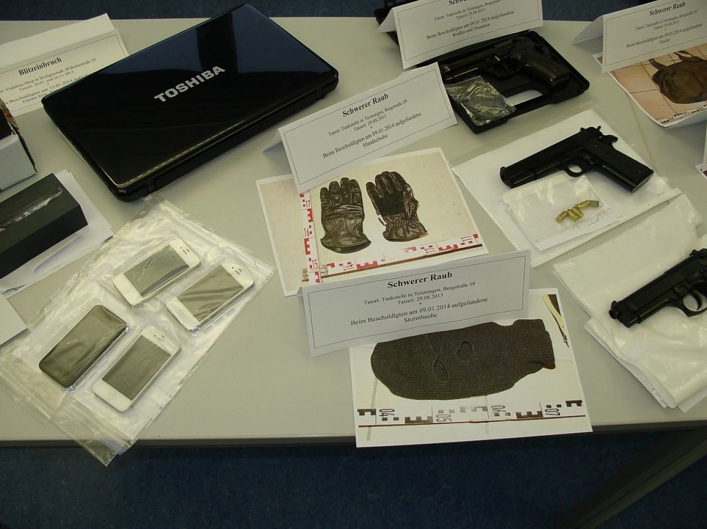 Bei der Durchsuchung der Wohnungen der Beschuldigten wurden umfangreiche Beweise sichergestellt. Darunter Schreckschusswaffen, Masken und Bekleidung sowie eine Identifizierungskarte der Tankstellenbeschäftigten. Selbst die Tasche, in der die Räuber ihre Beute abtransportierten, ist gefunden worden. Darüber hinaus fanden die Ermittler Betäubungsmittel, einen Schlagring und Munition. Weitere sichergestellte Beweise deuten darauf hin, dass die Beschuldigten auch in Betrugsstraftaten verwickelt sind. Die Ermittlungen in diesem Fall sind noch nicht abgeschlossen. Erfolg hatten die Kriminalisten auch bei den Ermittlungen zu zwei Einbrüchen in ein Handy-Fachgeschäft in der Wilhelmstraße. Über das Wochenende vom 26. bis zum 28. Januar 2013 und am 26. November 2013 war in das Geschäft eingebrochen worden. Die Diebe hatten es auf Mobiltelefone, Laptops und Bargeld abgesehen.