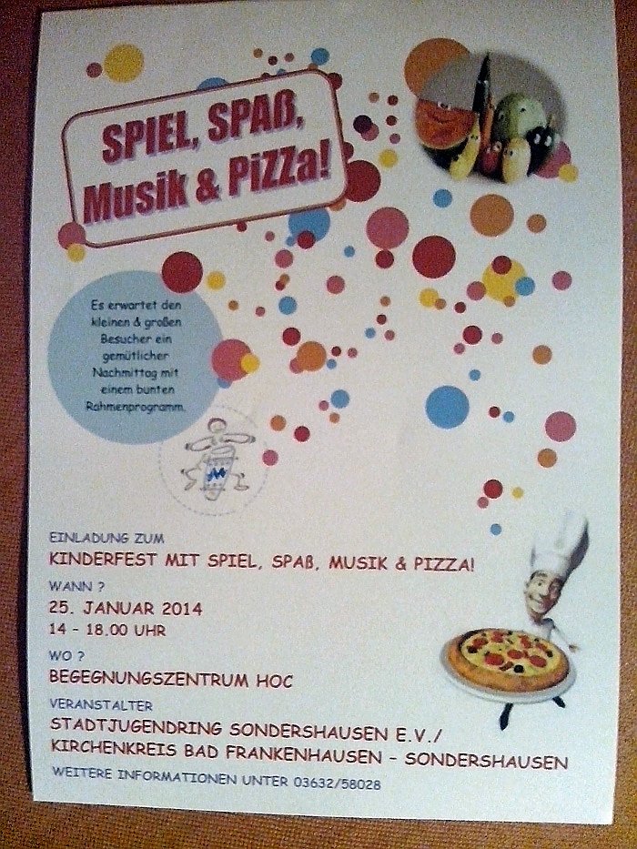Am Samstag den 25. Januar 2014 von 14 - 18.00 Uhr lädt der Stadtjugendring Sondershausen e. V. und der Kirchenkreis Bad Frankenhausen- Sondershausen zu einen gemütlichen Nachmittag rund um die Themen Musik und gesunde Ernährung ein.