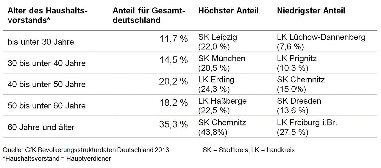 Den größten Anteil haben in Deutschland die Senioren-Haushalte (60 Jahre und plus) mit 35,3 Prozent, gefolgt von den 40-49-Jährigen mit 20,2 Prozent, den 50-59-Jährigen mit 18,2 Prozent und den 30-39-Jährigen mit 14,5 Prozent. Der Anteil der jungen Haushalte unter 30 Jahren ist mit 11,7 Prozent bundesweit weiterhin am geringsten.