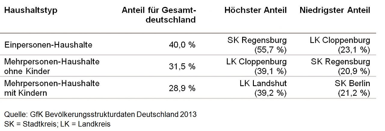 Der Anteil der Einpersonen-Haushalte in Deutschland liegt laut der aktuellen Studie bei 40 Prozent. Im gesamtdeutschen Vergleich lag im Jahr 2013 der Anteil der Mehrpersonen-Haushalte ohne Kinder bei 31,5 Prozent und damit über dem Anteil der Haushalte mit Kindern von 28,5 Prozent. Bei den Singlehaushalten liegt im Vergleich der deutschen Kreise wie in den Vorjahren der Stadtkreis Regensburg mit einem Anteil von 55,7 Prozent ganz vorn. Das ist das 1,4-Fache des Bundesdurchschnitts. Der zweitplatzierte Stadtkreis Berlin ist mit 54,3 Prozent, gefolgt von den Stadtkreisen Würzburg, München und Hamburg. Am niedrigsten ist der Single-Haushaltsanteil im Landkreis Cloppenburg mit 23,1 Prozent.