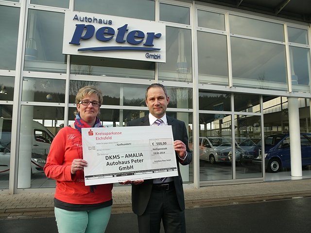 Thomas Bänder, seit 1. Januar 2014 in Heilbad Heiligenstadt Centerleiter der Autohaus Peter Gruppe, freute sich sehr, dass er den Scheck in Höhe von 500 Euro an Heike Büchner übergeben konnte. Die Heiligenstädterin engagiert sich seit zehn Jahren für die DKMS. Ihre Tochter war im Alter von vier Jahren selbst an Krebs erkrankt und konnte durch einen Spender gerettet werden. Heike Büchner setzt sich deshalb auch verstärkt für krebskranke Kinder ein und ist im Vorstand der Elternhilfe für das krebskranke Kind Göttingen.