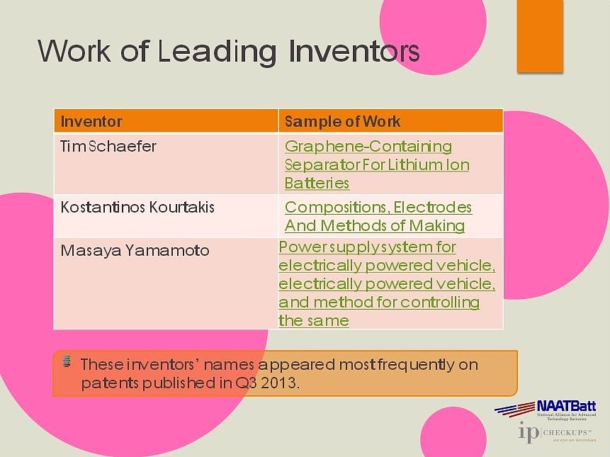 Die Nationale Allianz aus den Vereinigten Staaten von Amerika NAATBatt hat, wie jetzt bekannt wurde, in ihrem ersten Bericht eine Analyse von Erfindungen (intellectual property) auf dem Gebiet Batterien und Kondensatoren vorgenommen und veröffentlicht. Der Report steht im Internet zur Verfügung.