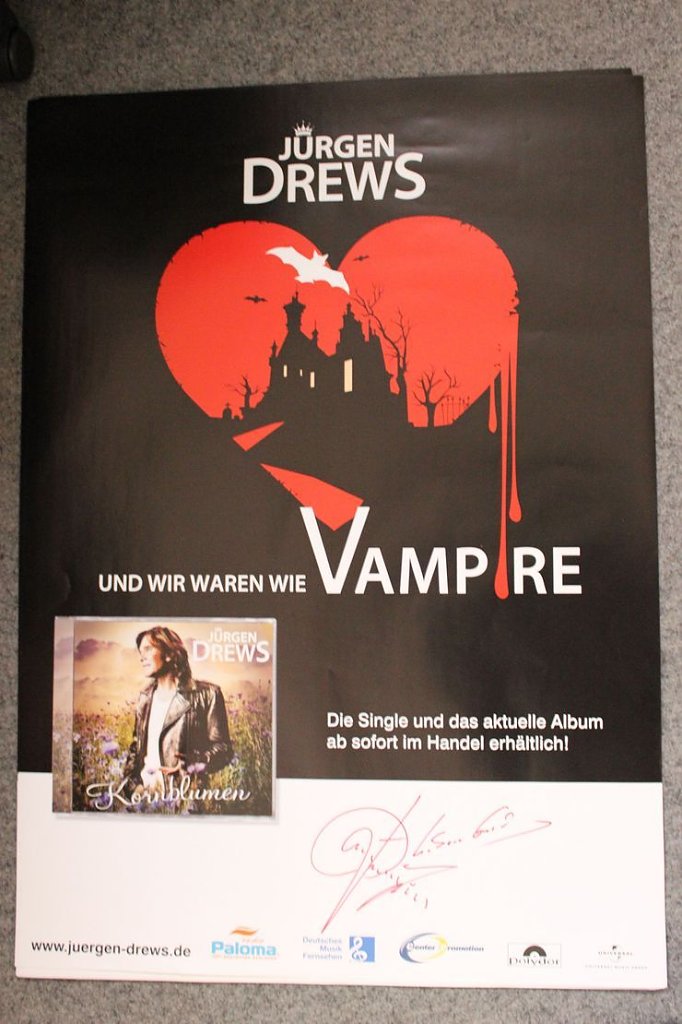 Und wir waren wie Vampire heißt der druckvolle Schlagerfox-Kracher aus dem Hause Universal Music, die mit über 100 Chart Hits in ihrer Historie aufwarten können. …und wer nun also als Vampir in den Karneval ziehen möchte, der bekommt von Jürgen Drews seinen ganz speziellen Titelsong! Für viele ein passender Titel für eine Drews Single, denn auch Onkel Jürgen scheint irgendwie unsterblich zu sein und scheut das Tageslicht, wenn er jedes Wochenende nachts von Auftritt zu Auftritt quer durch Deutschland unterwegs ist!
