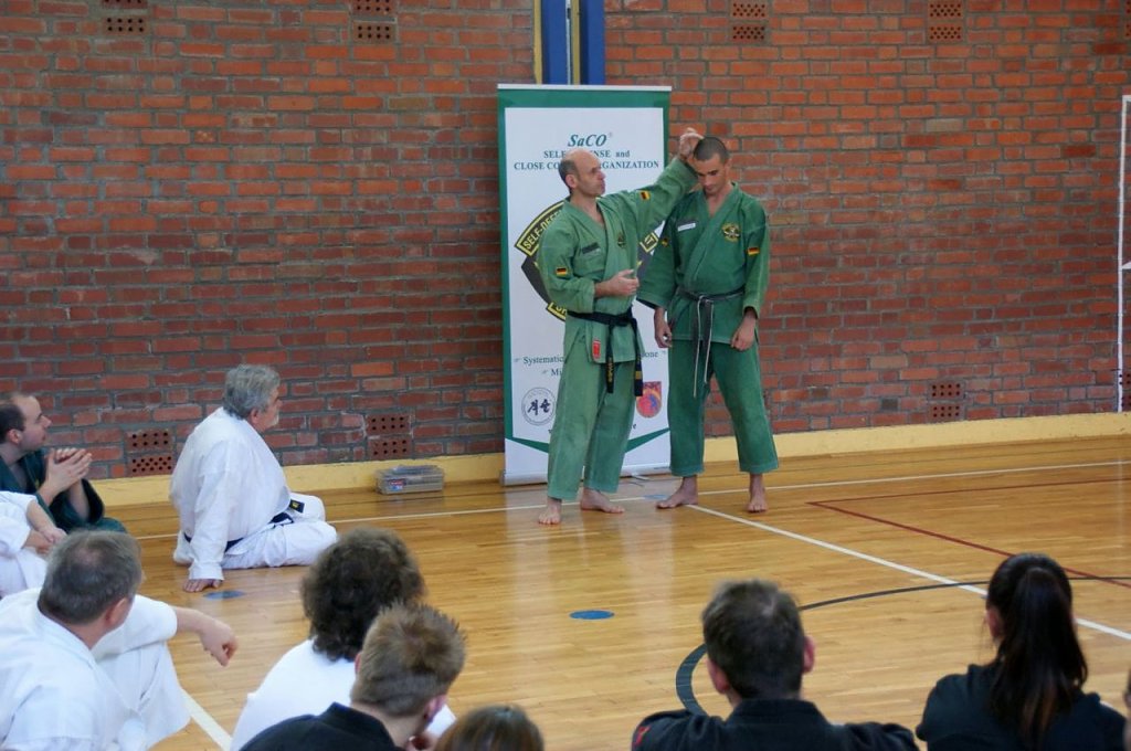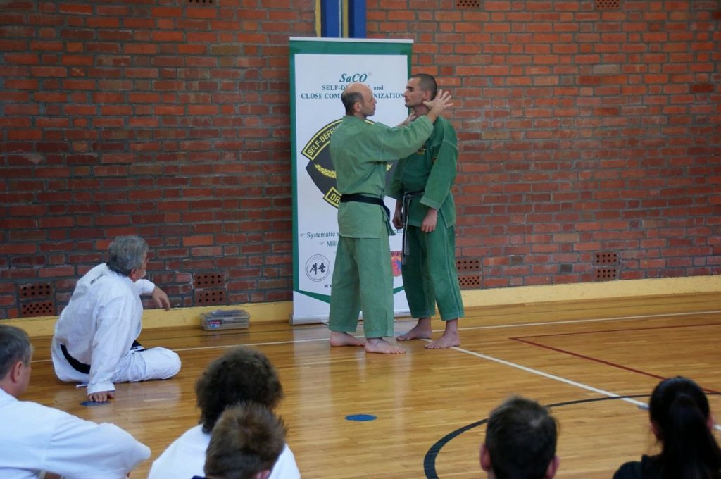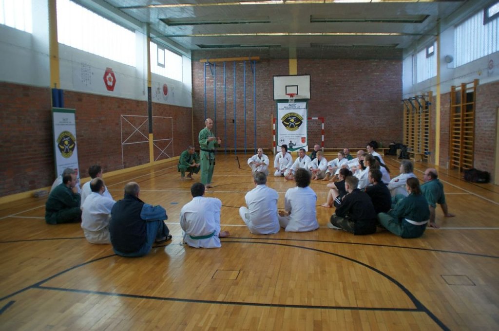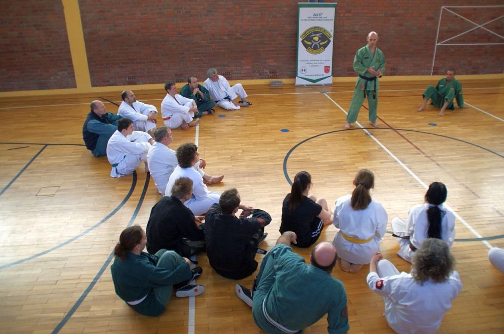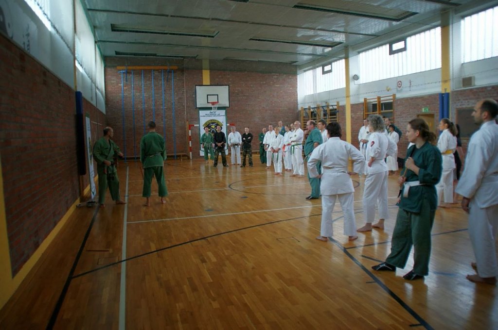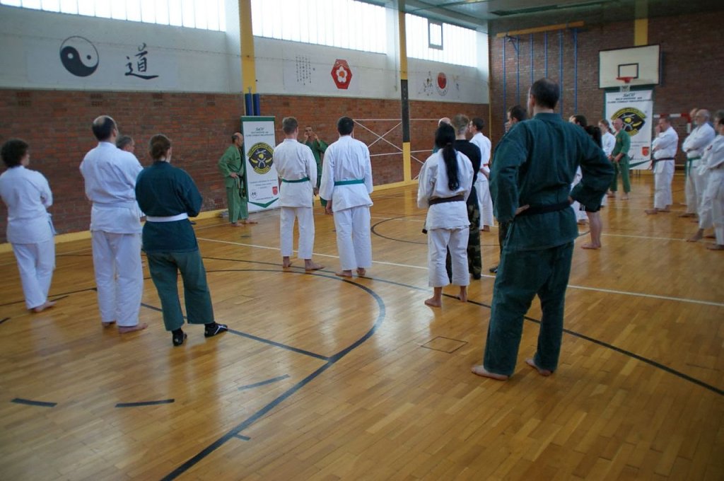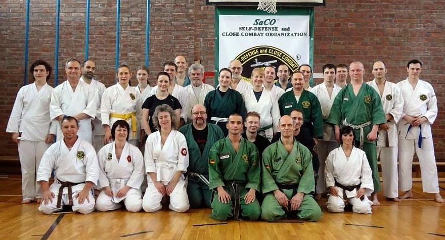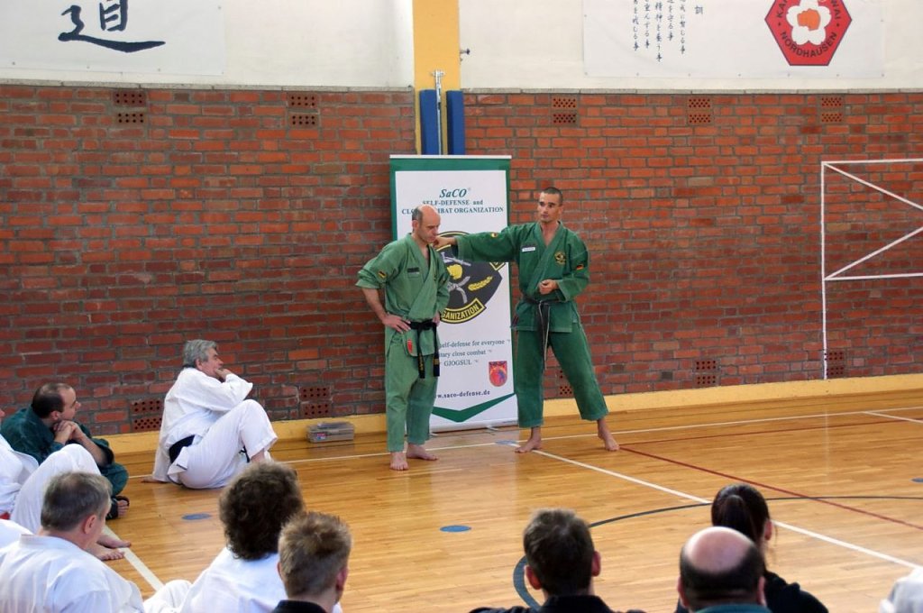 30 Kampfkunstinteressierte aus 10 Vereinen Deutschlands, von Berlin bis Hirschberg, folgten der Einladung des Cheftrainers Frank Pelny, 5. DAN Karate, 4. MG SaCO, 4. DAN Ryûkyû Kobudô. Unterstützt wurde er diesmal wieder von Sebastian Edelmann, selbst Meister im Karate, Kobudô, SaCO und Vereinsvorsitzender des JITOKU-DO Halle.