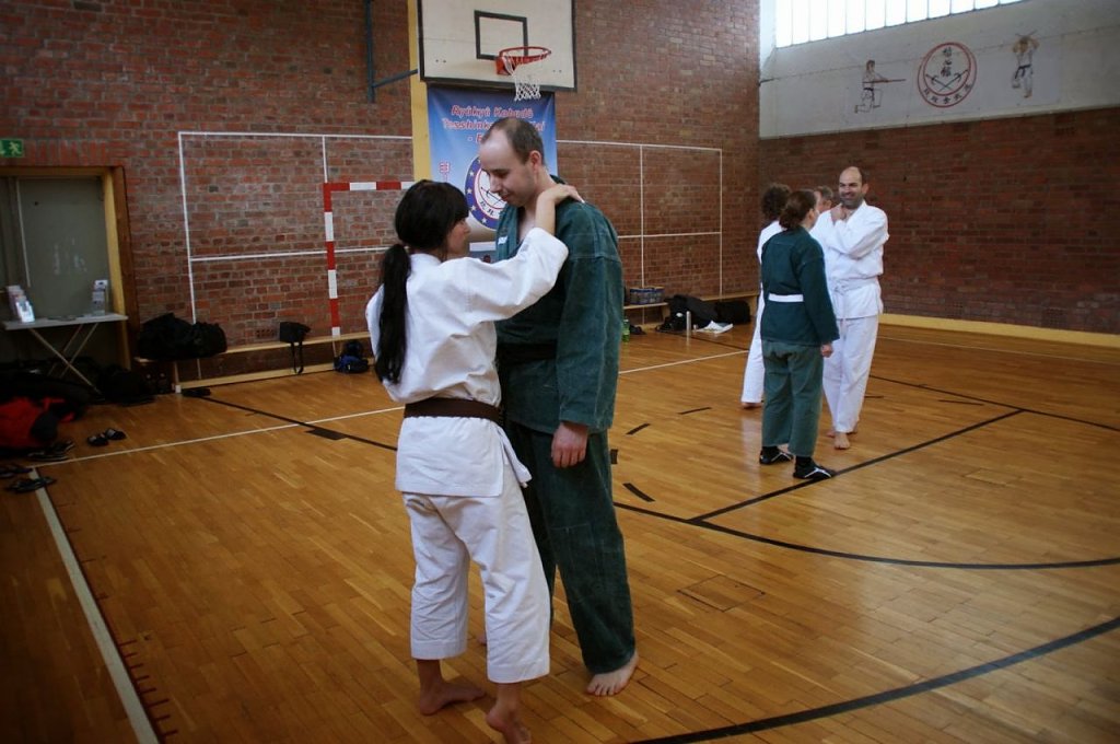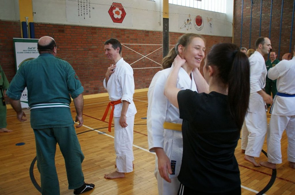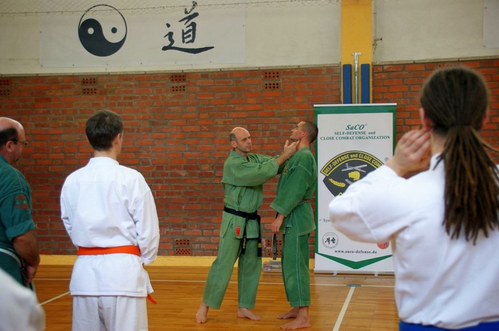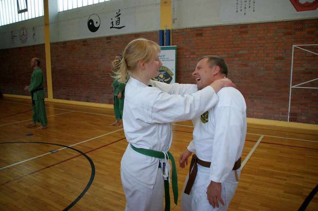 Schließlich muss auch im Ernstfall der Selbstverteidigung, der Verteidiger dem Angreifer gegenüber den Grundsatz der Verhältnismäßigkeit beachten! Im Anschluss an ein wenig Theorie zur Anatomie und zum Nervensystem, durften die Übenden mit Partnern zusammen vorsichtig die Wirkung der gezielt stimulierten Punkte beobachten und auch selbst erspüren.
