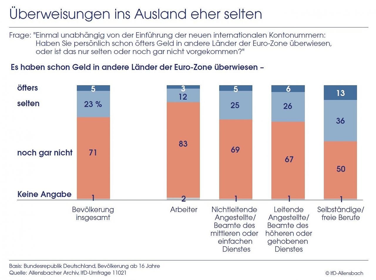 Die Mehrheit ist aber nicht von den Vorteilen der Umstellung überzeugt. Lediglich 36 Prozent halten die Einführung von IBAN und BIC für sinnvoll, genauso viele halten sie für nicht sinnvoll. Ob man die Umstellung für sinnvoll hält, hängt dabei vor allem von der Häufigkeit ab, mit der man selbst Geld ins europäische Ausland überweist. Von denjenigen, die öfters Geld ins Ausland überweisen, halten 69 Prozent die Einführung der internationalen Kontonummern für sinnvoll. Von denjenigen, die zumindest selten Geld ins Ausland überweisen, sehen 48 Prozent die Vorteile eines einheitlichen Systems für den Zahlungsverkehr. Allerdings sind diejenigen, die öfters oder zumindest selten Geld in andere europäische Länder überweisen, in der Minderheit. Lediglich 5 Prozent der Deutschen überweisen öfters, weitere 23 Prozent selten Geld über die Bundesgrenze hinweg. Am häufigsten nehmen Selbständige und Freiberufler internationale Überweisungen vor. Von ihnen haben 13 Prozent bereits öfters, weitere 36 Prozent selten Geld innerhalb Europas transferiert.