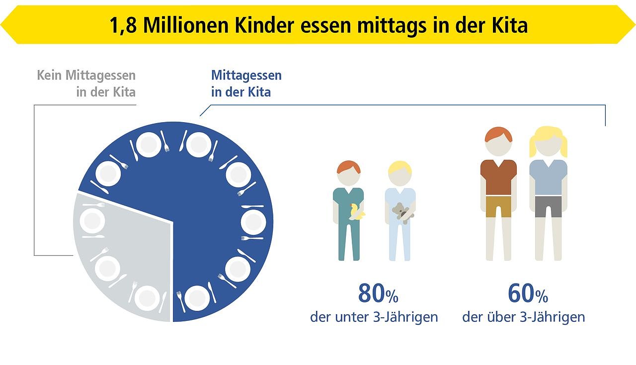 Gemessen am wissenschaftlich begründeten Qualitätsstandard der Deutschen Gesellschaft für Ernährung (DGE) schneidet die Mittagsverpflegung in den meisten deutschen Kitas schlecht ab: Nur zwölf Prozent der Kitas reichen den Kindern genügend Obst, lediglich 19 Prozent ausreichend häufig Salat oder Rohkost. Fisch steht ebenfalls zu selten auf dem Speiseplan: Diesen DGE-Standard erfüllen nur 30 Prozent der Kitas. Fleisch hingegen bieten drei Viertel der Kitas zu häufig an. Auch die Caterer sind noch zu wenig auf kindgerechte Verpflegung ausgerichtet: Deutschlandweit lassen zwei von drei Kitas das Mittagessen anliefern. Aber nur jeder zehnte Caterer, der eine Kita beliefert, bietet speziell an den Bedarfen von Kindern ausgerichtete Mittagessen an. Zudem sind die Kitas häufig nicht hinreichend für die Verpflegung ausgestattet: Die Küche vieler Kitas ähnelt der eines Privathaushalts. Nicht einmal jede dritte Kita verfügt über einen Speiseraum. Häufig müssen die Kinder deshalb in ihrem Gruppenraum essen. Nur jede dritte Kita beschäftigt hauswirtschaftliches Fachpersonal.