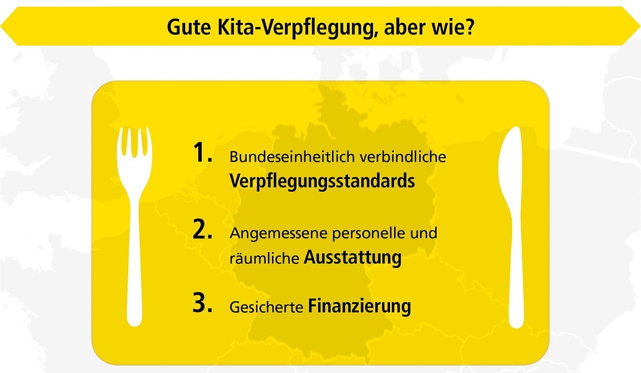 Die Verpflegung wird bei der Finanzausstattung der Kitas selten berücksichtigt, es fehlt an hauswirtschaftlicher Fachkompetenz sowie an adäquater Küchenausstattung und Speiseräumen. Wir brauchen bundesweit verbindliche Qualitätsstandards für die Kita-Verpflegung.