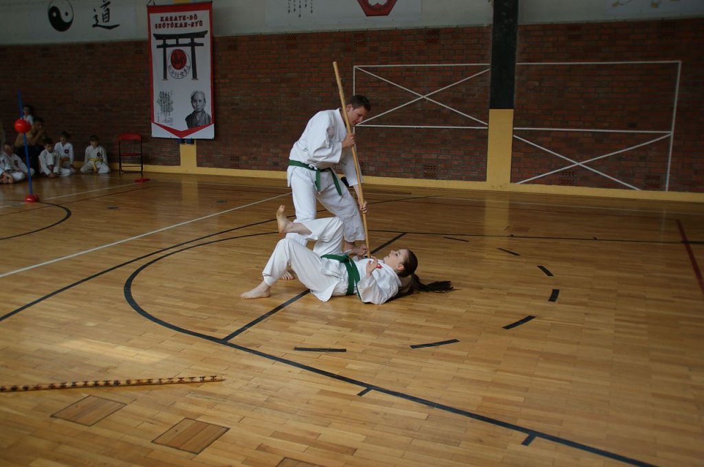 Dazwischen kam nun eine Darbietung der Kobudô-Kämpfer. Gesine Hauschild, amtierende Deutsche Meisterin im Ryûkyû Kobudô Tesshinkan, stellte ihre Fähigkeiten mit dem Bô (Langstock) unter Beweis und Florian Bruns, DM-Dritter im Team-Kumite, zeigte eine Form mit Tekkô (Handgewichten). Gemeinsam gaben die beiden dann noch eine kurze aber spektakuläre Vorstellung zum freien Kampf mit dem Bô. Dann waren die männlichen Kämpfer der Gruppe 8. - 7. Kyu (Gelb- und Orangegurte) an der Reihe. Sie maßen sich im Kata-Lauf und im abgesprochenen Kumite (Zweikampf).