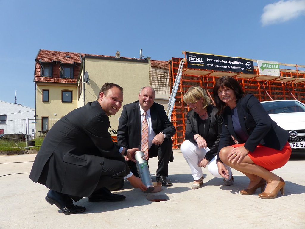 Am Vormittag legten dort die beiden Geschäftsführer gemeinsam mit Staatssekretärin Inge Klaan und Sondershausens Beigeordneter Cornelia Kraffzick den Grundstein in die bereits gegossene Bodenplatte. Sie befindet sich auf dem Grundstück, das Firmengründer Helmut Peter exakt vor 20 Jahren erworben hatte und auf dem vor 17 Jahren das Mercedes-Autohaus eröffnet wurde.