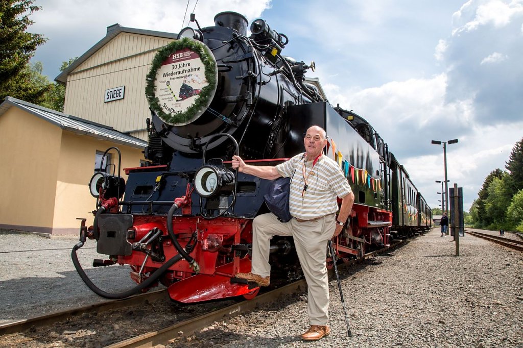 Am Zielbahnhof Stiege würdigten dann Birgit Keller, Landrätin des Landkreises Nordhausen und stellvertretende Aufsichtsratsvorsitzende der HSB; Heike Schäffer, stellvertretende Landrätin des Landkreises Harz, Jürgen Bentzius als Bürgermeister der Stadt Harzgerode sowie HSB-Geschäftsführer Matthias Wagener die historische Bedeutung des Wiederaufbaus bis zum heutigen Tag und prämierten die originellsten 1980´er Jahre-Kostüme der Fahrtteilnehmer. Für musikalisch stimmige Unterhaltung sorgte sowohl während der Fahrt als auch am Zielbahnhof die Band Herman´s Dixie Express. Das passende historische Umfeld am Bahnhof Stiege bildeten liebevoll aufgearbeitete Trabis und ein Wartburg.