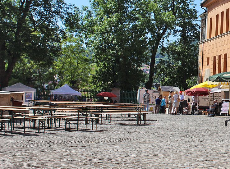 Bis auf einige wenige Schirmchen an zwei der Stehtischen standen alle Sitzgelegenheiten, besonders wenn man etwas essen wollten in der prallen Sonne. Sitzgelegenheiten im Schatten, nur durch Zufall . Viele flüchteten auf die Treppen im Aufgang zum Schlossmuseum.