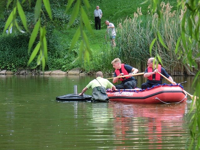 Mitarbeiter des Bauhofes der Stadt und Mitglieder der Heiligenstädter Feuerwehr haben die neue Wasser-Fontäne per Schlauchboot gestern eingebaut und in Betrieb genommen.
