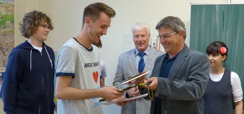 Schulleiter Herr Köthe und der stellvertretende Schulleiter Herr Vogt überreichten Maxime unter anderem ein Humboldt-Shirt und eine Plakette zur Erinnerung an seine Schulzeit am Humboldt-Gymnasium. Und so nahm Maxime sicher mit einem weinenden und einem lachenden Auge Abschied von seiner Schule.