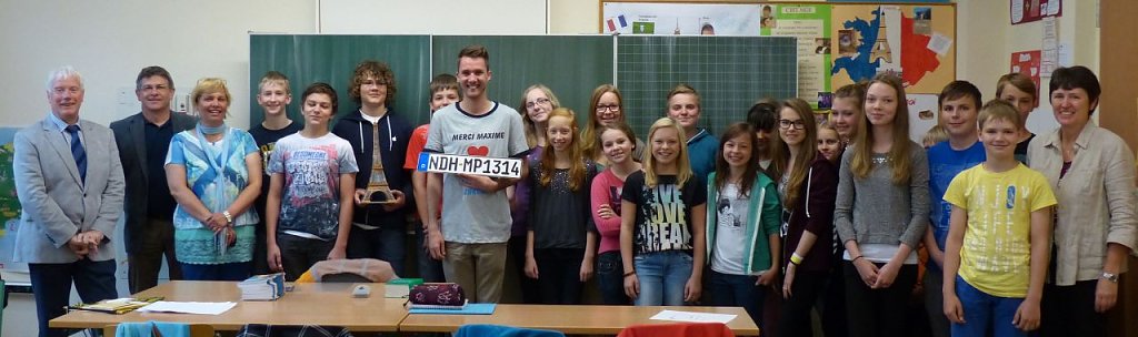Für seine letzte Unterrichtsstunde hatten die Schulleitung und die Französisch-Schülerinnen und -Schüler mit Ihrer Lehrerin Anja Ruhnau einiges vorbereitet. Von den 7.-Klässlern bekam Maxime Briefe, ein bedrucktes T-Shirt, ein kreativ gestaltetes Plakat über Nordhausen und wurde mit selbstgebackenem Kuchen und französischen Liedern verabschiedet.