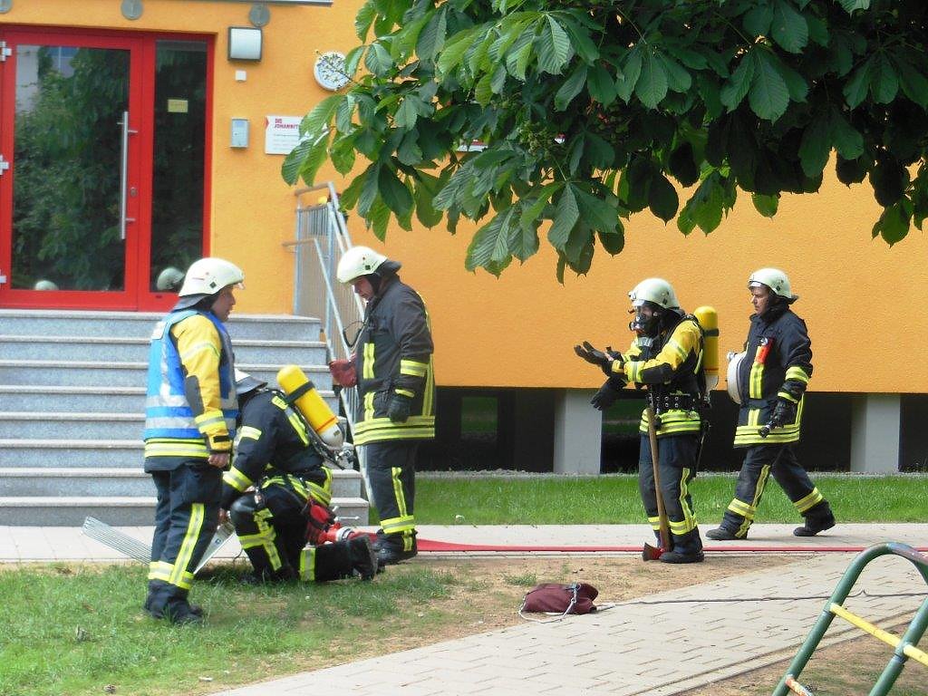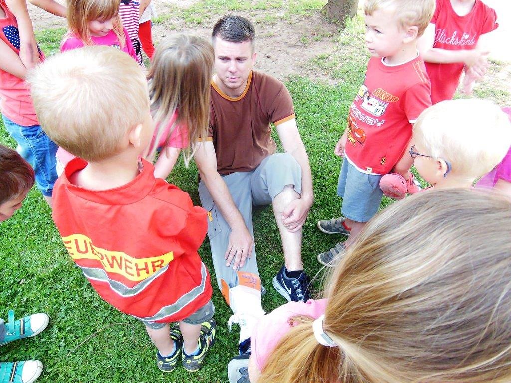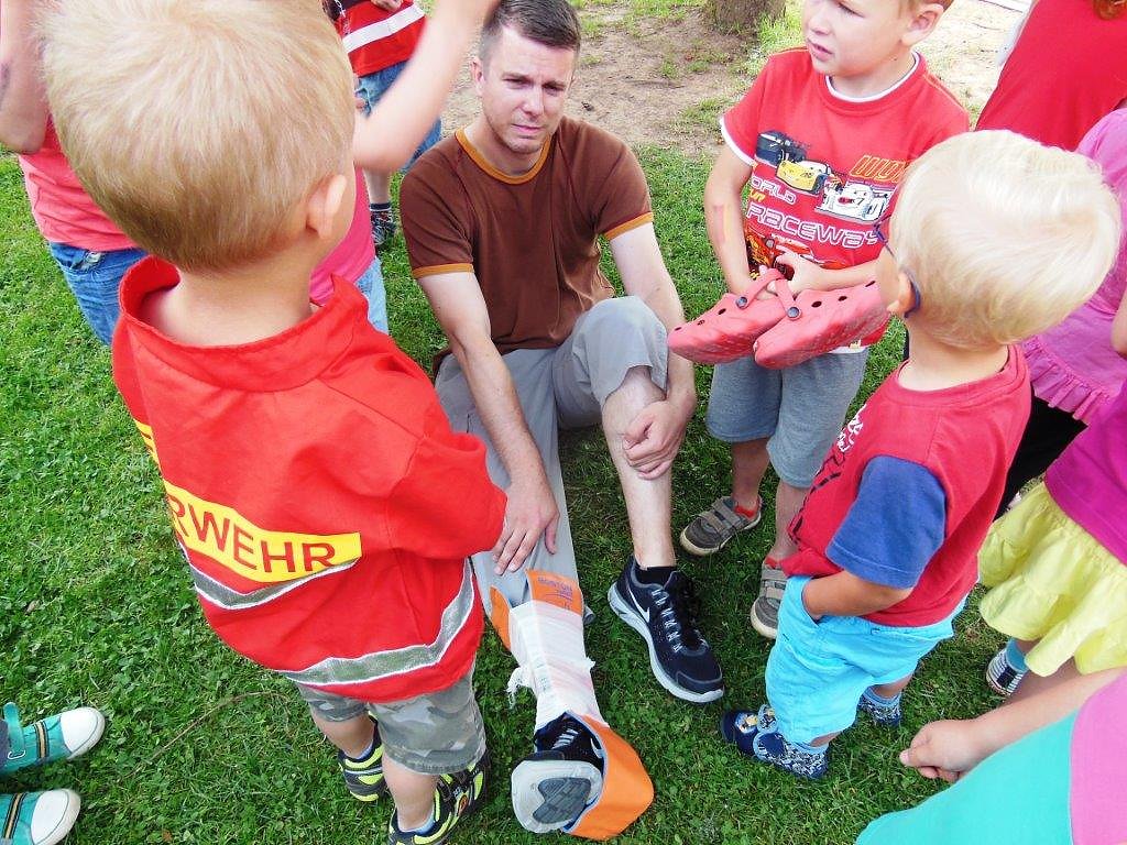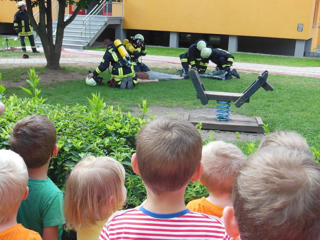 Aufgeregt und aus sicherem Abstand beobachten die Kleinen die Situation. O'weh, der Erzieher Thomas hat sich verletzt und wird mit einer Trage von den Feuerwehrleuten aus dem Objekt gerettet. Schnell wird er verarztet und die Kinder trösten ihn.