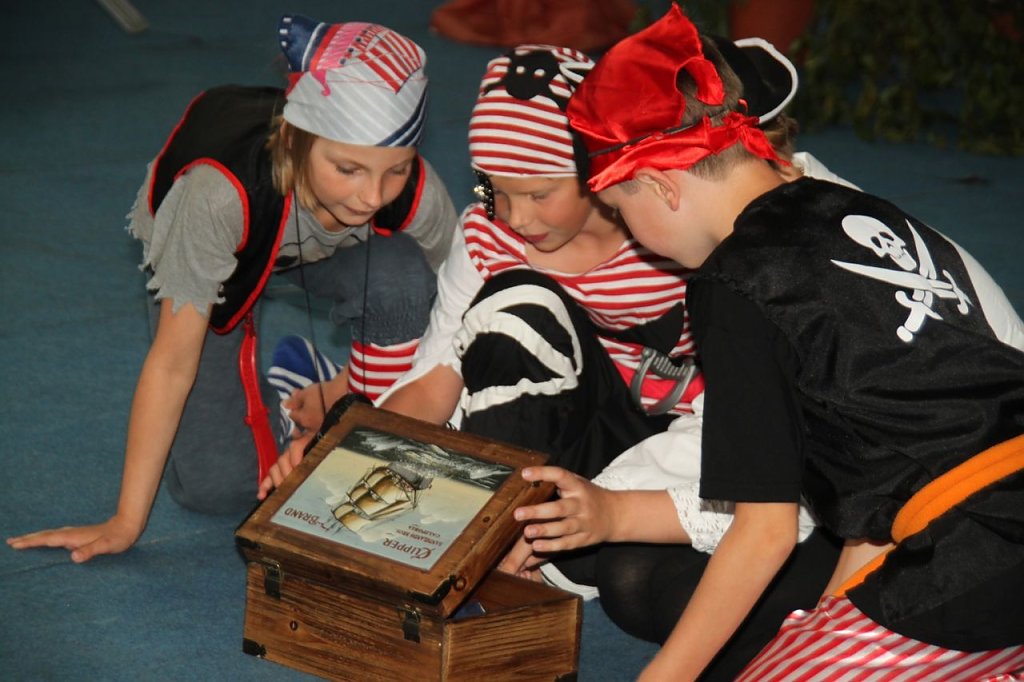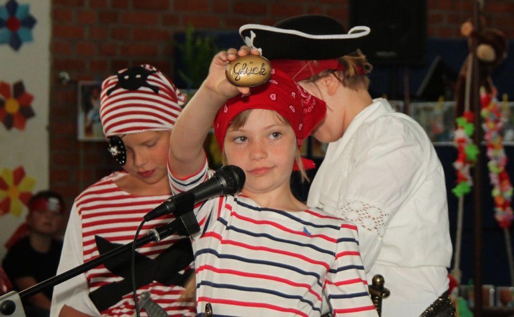 Die Drittklässler haben das Programm mit vielen Liedern und einem Theaterspiel gemeinsam mit den anderen Klassen einstudiert. Am Ende fanden die Piraten eine Schatzkiste - gefüllt mit Goldsteinen mit Botschaften für die Viertklässler, mit vielen guten Wünschen für die weiterführende Schule und kleinen Geschenken.