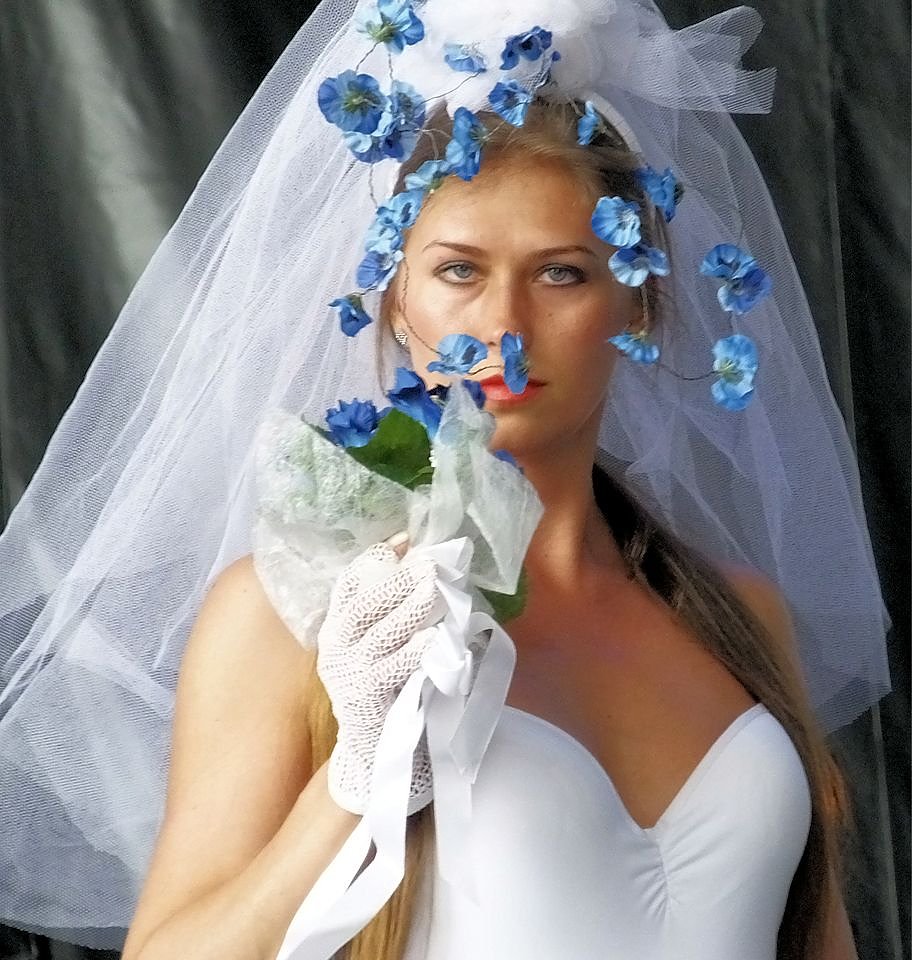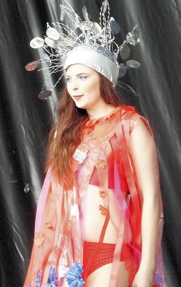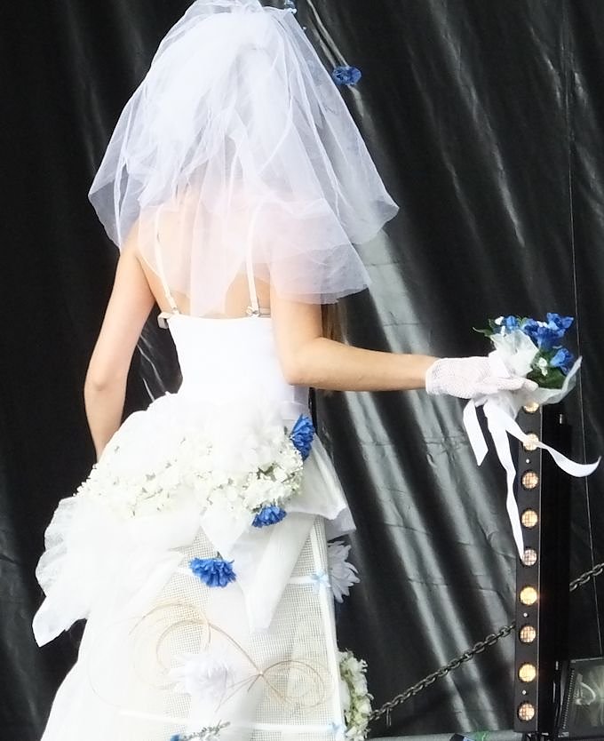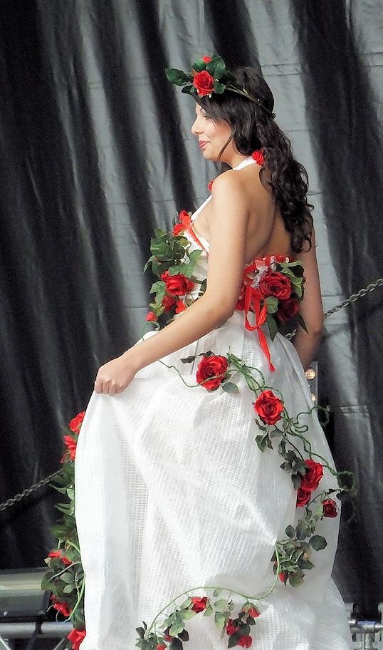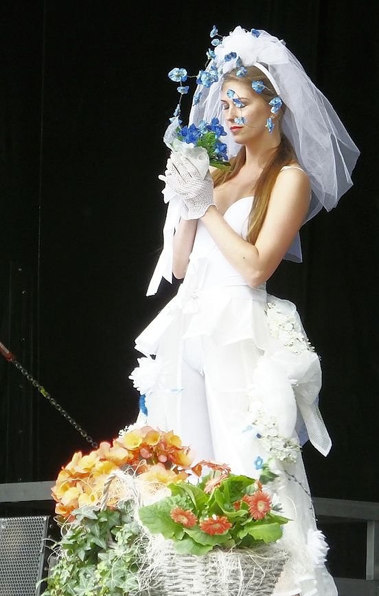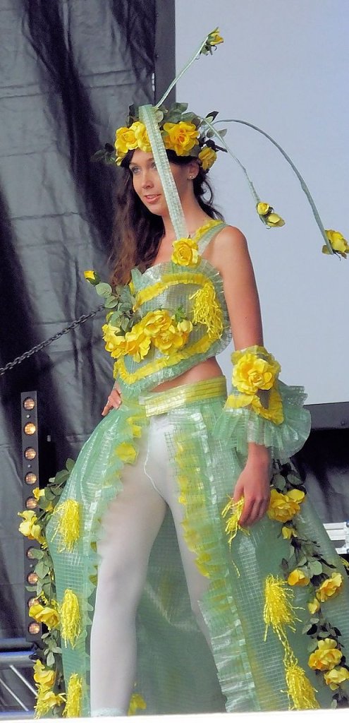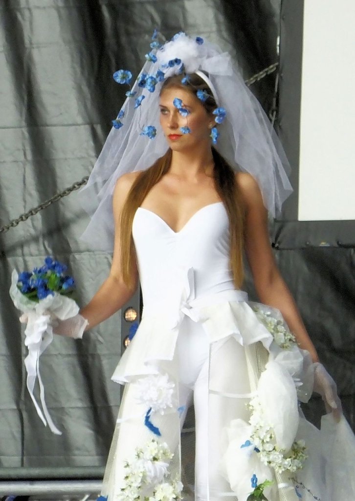 Der Moderator meinte: Ich sehe viele Frauenaugen leuchten und einige Männer die Angst um ihre Finanzen haben. Ich muss aber die Frauen enttäuschen und kann die Männer beruhigen, dies sind alles Unikate und alle sind unverkäuflich. Da diese Hochzeitskreationen aus Recyclingmaterial sind, werden sie auch noch auf einen Recyclingmesse gezeigt.