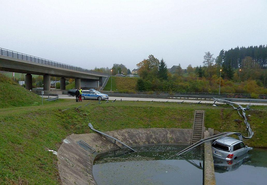 Das Auto durchbrach zuerst die Leitplanke und beschädigte diese dabei auf etwa 30 Metern. Anschließend schleuderte der Pkw in das ca. 5 Meter tiefer liegende Regenauffangbecken und kam zum Glück auf allen vier Rädern in dem mit Wasser gefüllten Becken zum Stehen.