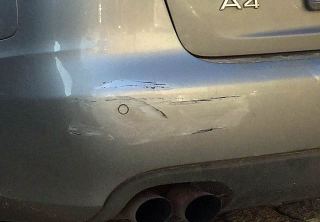 Als ich gegen 14:30 Uhr mit meinem Auto nach Hause fahren wollte bemerkte ich, dass jemand mein Auto hinten an der Stoßstange angefahren hatte.