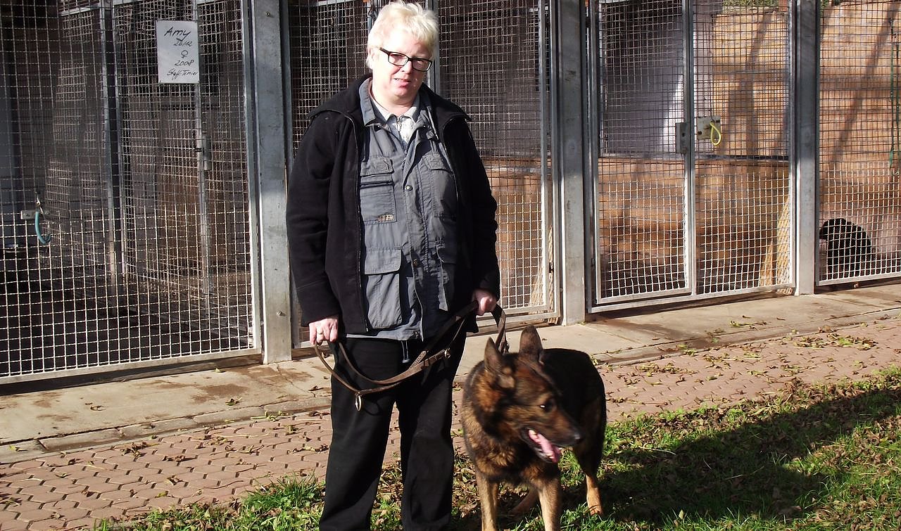 Seit Anfang Oktober leitet Birgit Hellrung das Tierheim An der Alten Schäferei. Hier mit Schäferhund Remo, der schon sieben Jahre lang dort betreut wird.