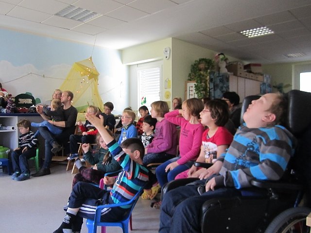 Wie es Benni und dem neuen Freund gelingt den Opa auszutricksen, um an Meerrettichschnaps zu gelangen, erfuhren die Schüler von Autorin Astrid Seehaus, die sich die Geschichte ausgedacht hat. Gemeinsam mit ihrem Mann, der sie auf der Gitarre begleitete, sangen die Kinder das Lied vom Drachen und ein Lese-Lied.