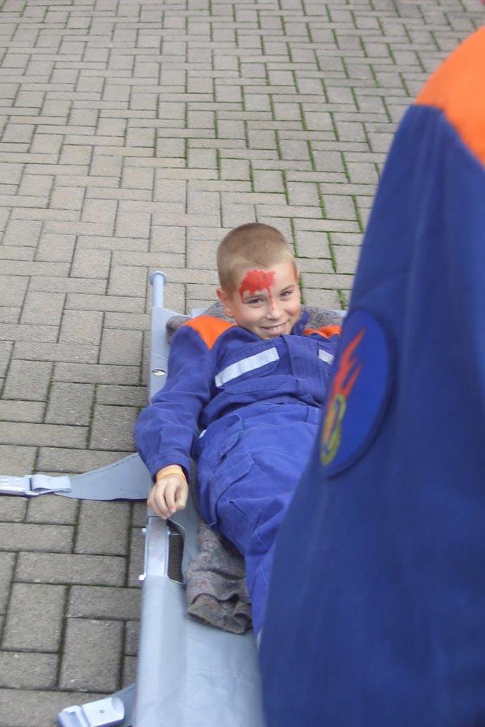 Von einer zweiten Seite wurden sie durch die Jugendfeuerwehr Bornhagen unterstützt. Die Feuerwehr Gerbershausen brachte zwei Strahlrohre zur Abschirmung in Stellung. Schnell füllte sich der Verletztensammelplatz der vom DRK und einigen jungen Brandschützern besetzt wurde. Auf Tragen und Liegen wurden die geschminkten Kinder verarztet. Insgesamt gab es sechs Verletzte zu betreuen und Versorgen.