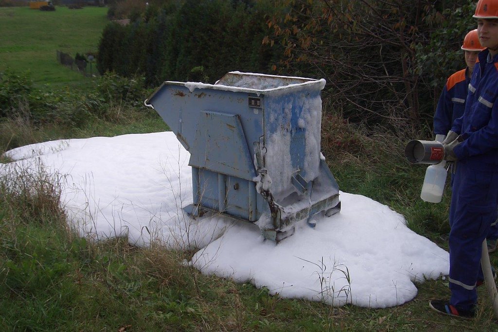 Mehrere Gefahrgutbehälter wurden geborgen und gekühlt, sowie ein brennender Container mit Schaum gelöscht. Zum Abschluss der Übung wurde die Werkhalle mittels Überdrucklüfter belüftet und noch einmal nach Verletzten abgesucht. Nach einer guten halben Stunde waren alle Personen gerettet. Danach ertönte die Meldung Feuer Aus – Wasser halt.
