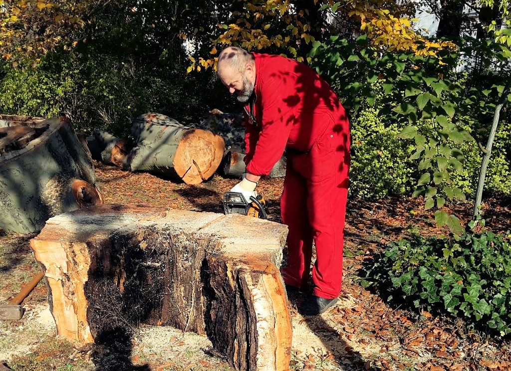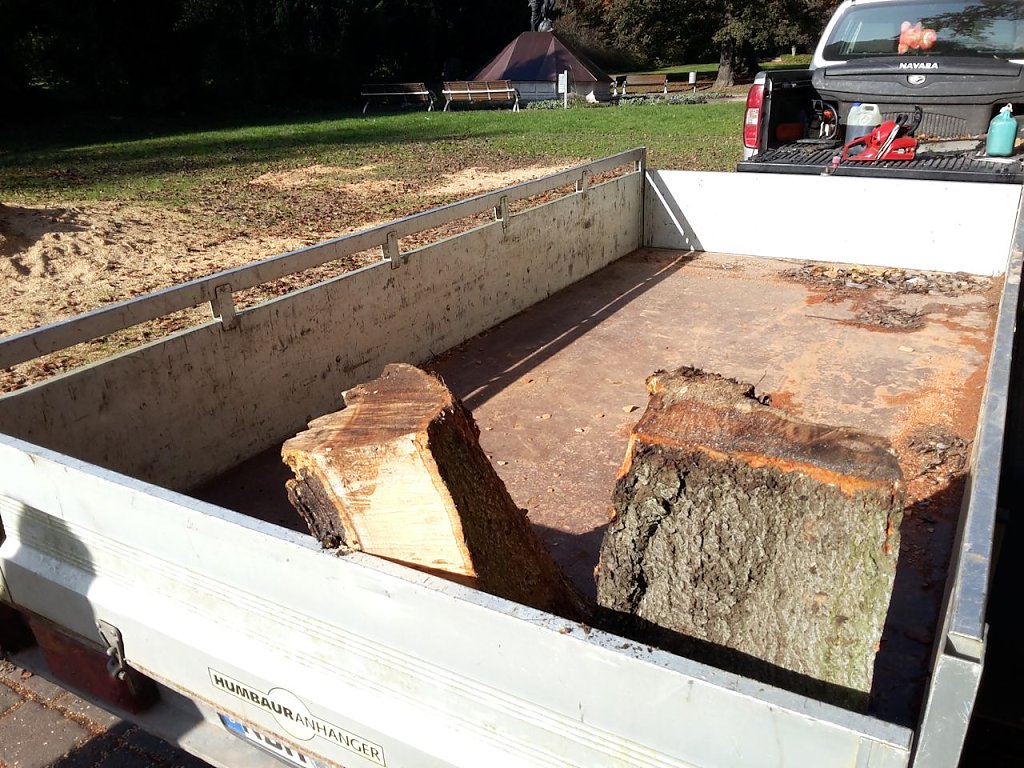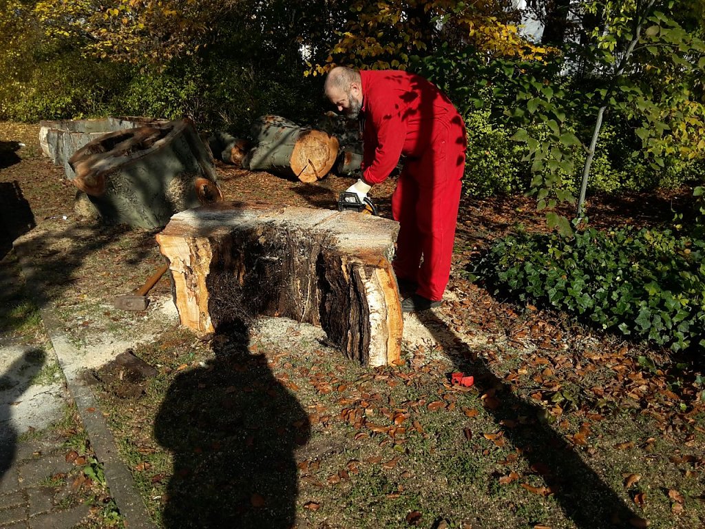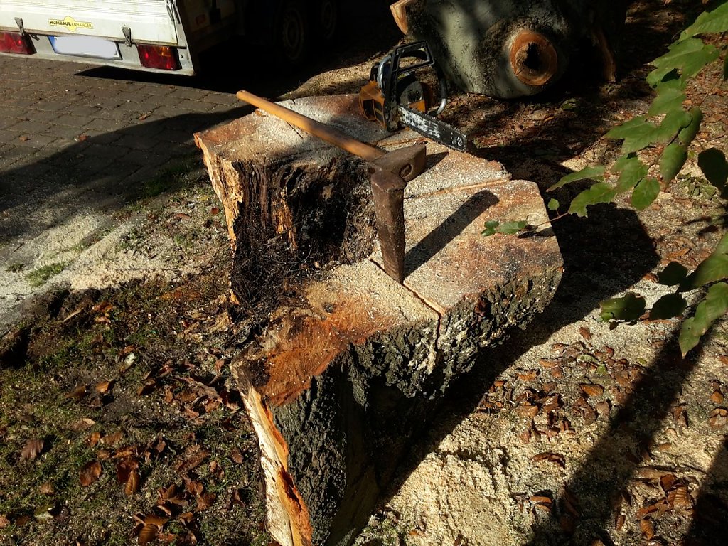 Ganz uneigennützig ist natürlich die ganze Sache nicht. Wie wir wissen ist Buche ein sehr gutes Brennholz. Einige gute Stücke zum Verbrennen werden schon abfallen. Alles im allem, die Stadt spart Geld und der gute Mann hat Brennholz. In den nächsten Tagen wird noch die Wurzel entfernt und eine neue Buche gepflanzt.